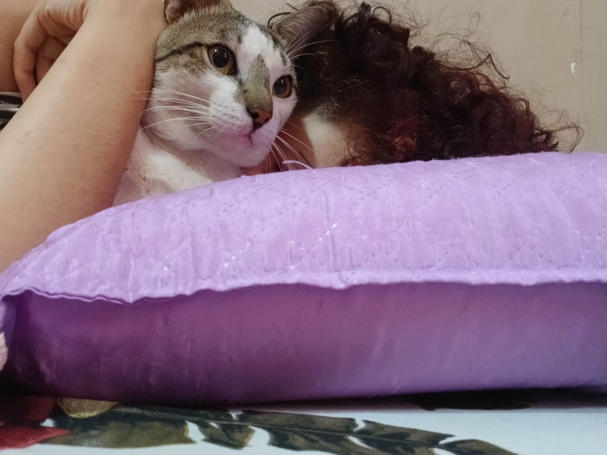 Gato macho branco com machas tigradas no rabo, patas traseiras, rosto, orelhas, uma mancha única redonda na barriga/costas e nas dobras das patas da frente, as bordas das orelhas faltam pequenissimos pedaços e tem uma pequena mancha meio opaca em um dos olhos (possivelmente no olho esquerdo)
