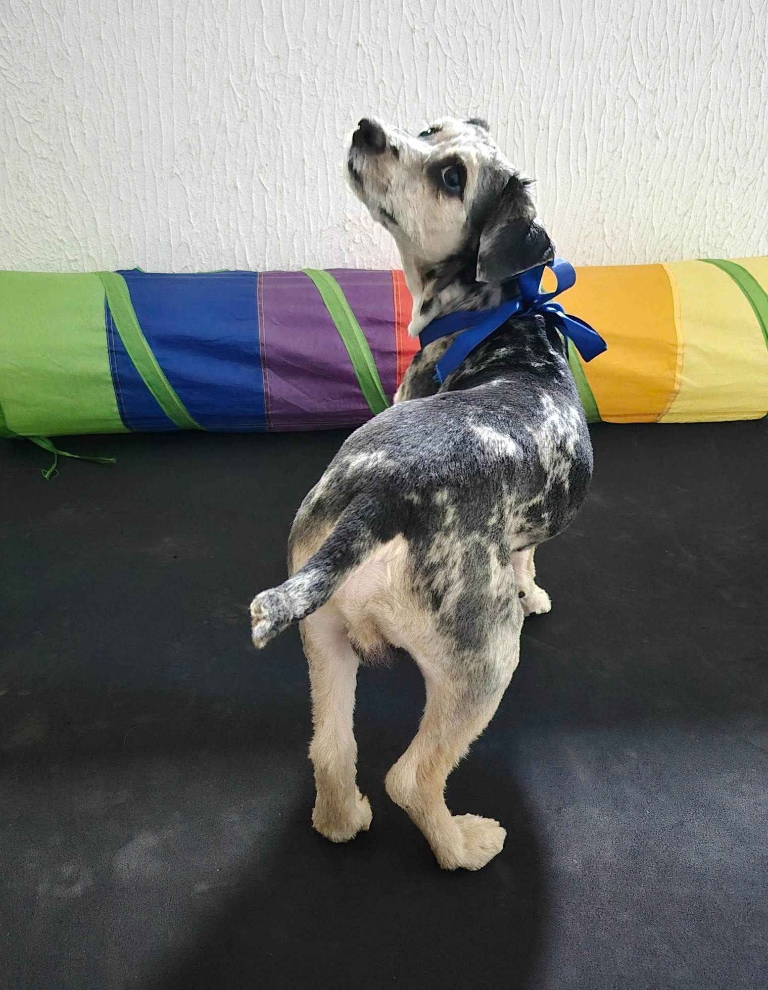 Esse cachorrinho foi abandonado em um galpão. Ele era de um homem que morava lá, ele foi embora e o deixou. Ele ficava algumas vezes preso na corrente, às vezes solto na rua e dormia no chão sujo. Pegamos ele na rua e levamos ao veterinário, tem entre 2 a 4 anos e foi tosado (ele é bem peludinho). Fizemos alguns exames, inclusive o pra cinomose (deu negativo), ele está saudável, foi vermifugado e vacinado. Ele não é castrado, mas eu pago a castração para quem adotar.
