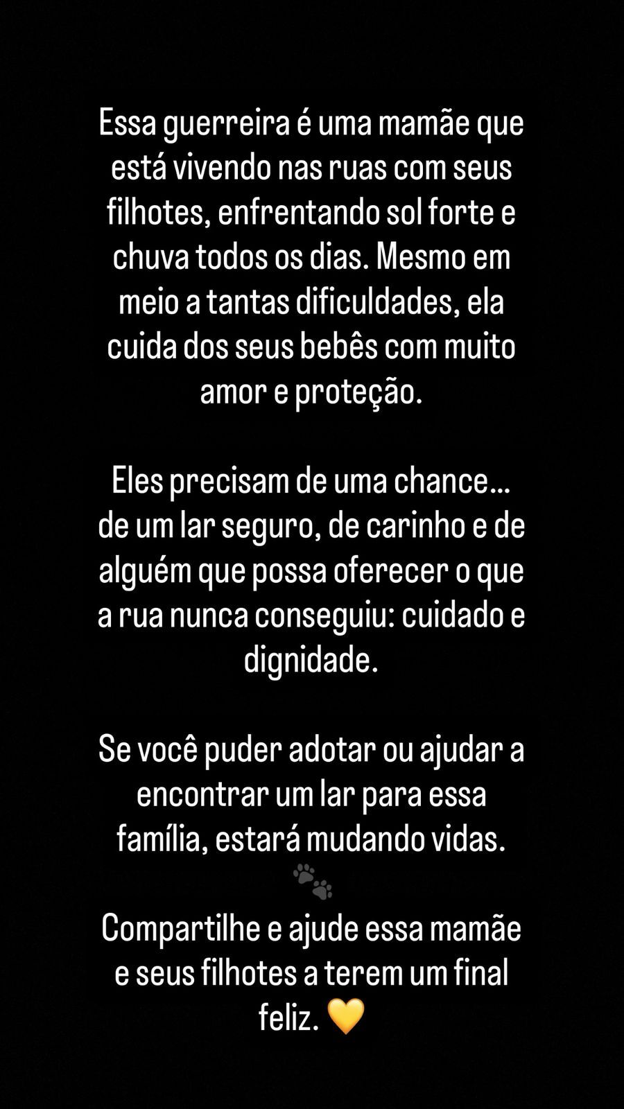Essa mãezinha foi encontrada na rua com seus filhotes, eram 6 filhotes um foi arrastado pela chuva, um foi adotado e ainda restam quatro filhotes para serem doados e a mãezinha.