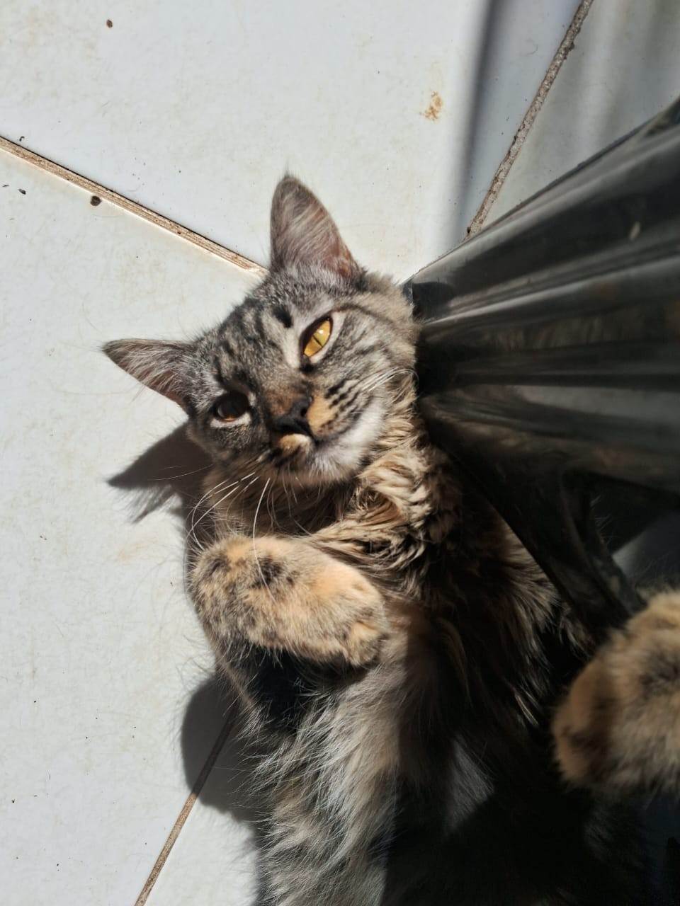 ?? Descrição: ela é Gata rajada (tigrada) cinza e marrom, olhos amarelos, pelo médio, muito dócil.”