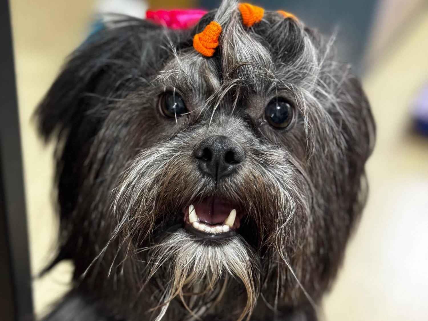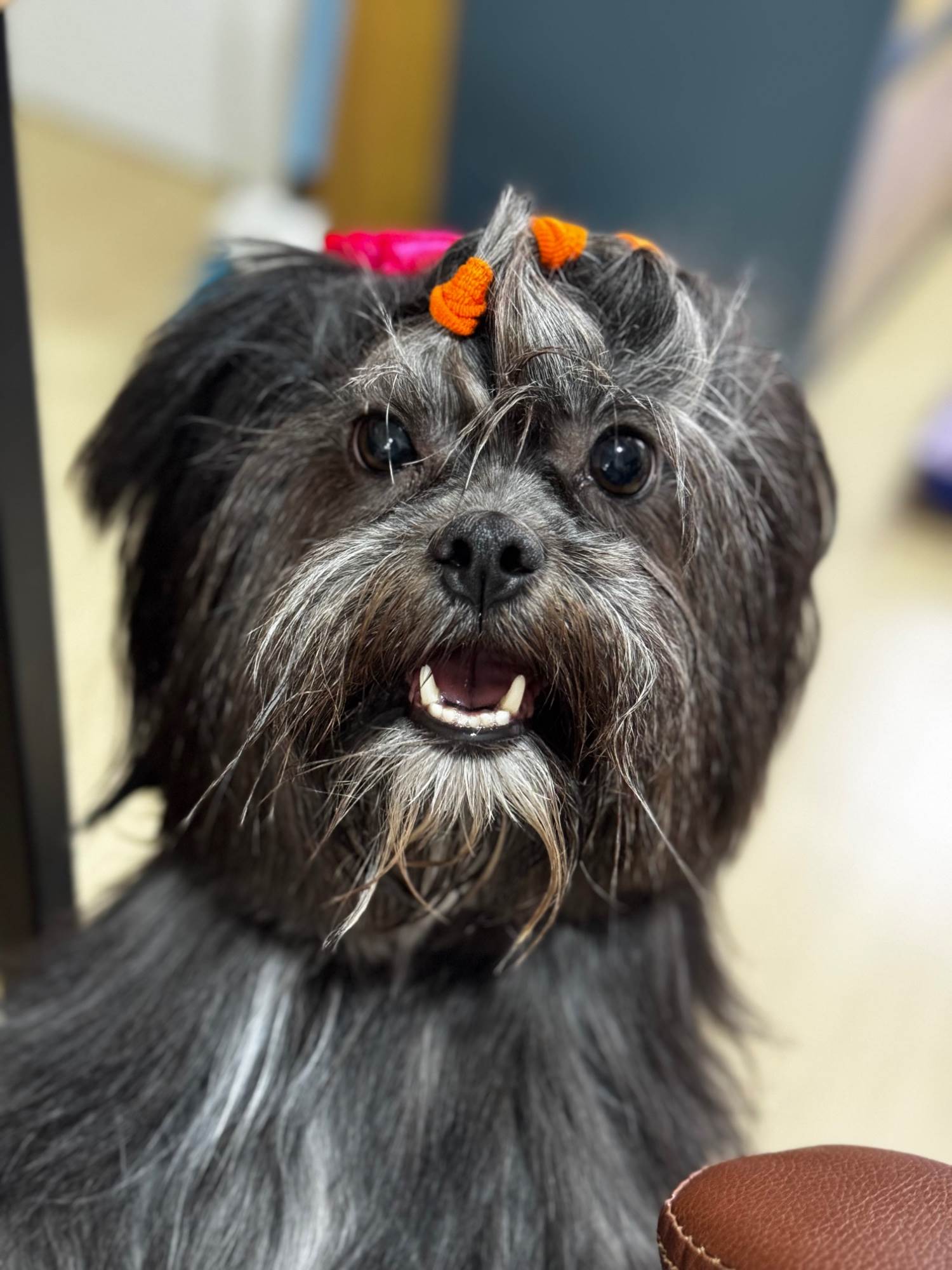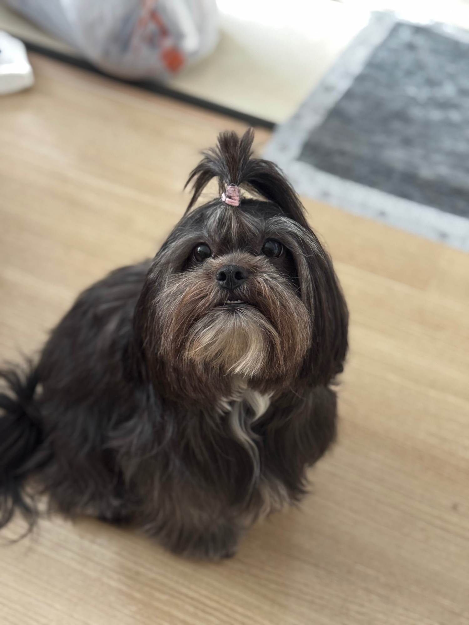 Teodora tem 3 anos (completou em out/25), é dócil e bem carente. É Lhasa Apso puro, pequeno porte e vive bem em apto ou casa pois já morou nos dois. É adestrada, faz necessidades no tapetinho em casa ou na rua, entende a maioria dos comandos, tem medo de estranhos (se esconde) mas quando se acostuma é muito brincalhona.