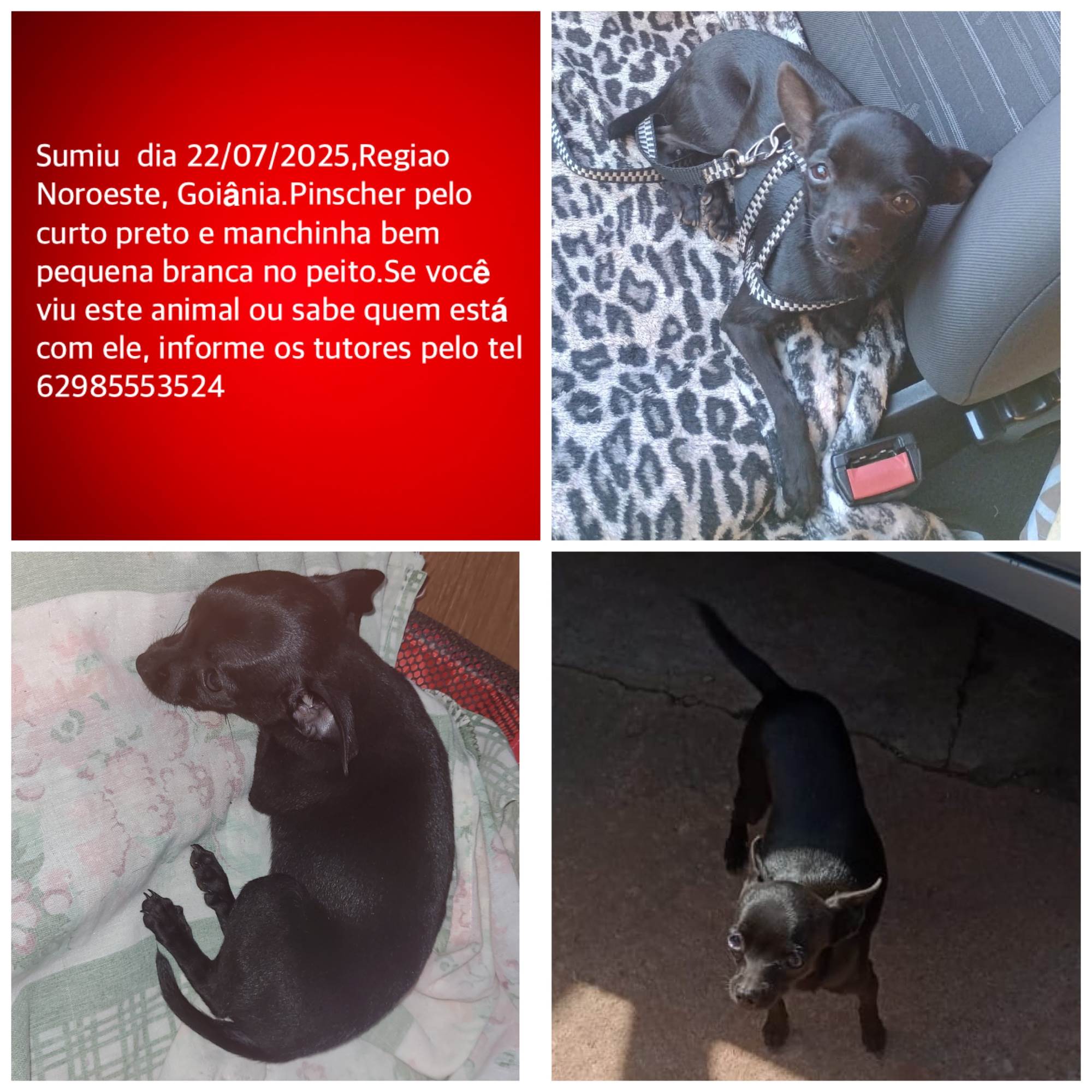 A Princesa sumiu dia 22/07/2025, Regiao Noroeste, Goiânia. Pequena pinscher pelo curto preto e manchinha bem pequena branca no peito. Se você viu este animal ou sabe quem está com ele, informe os tutores pelo tel 62985553524.