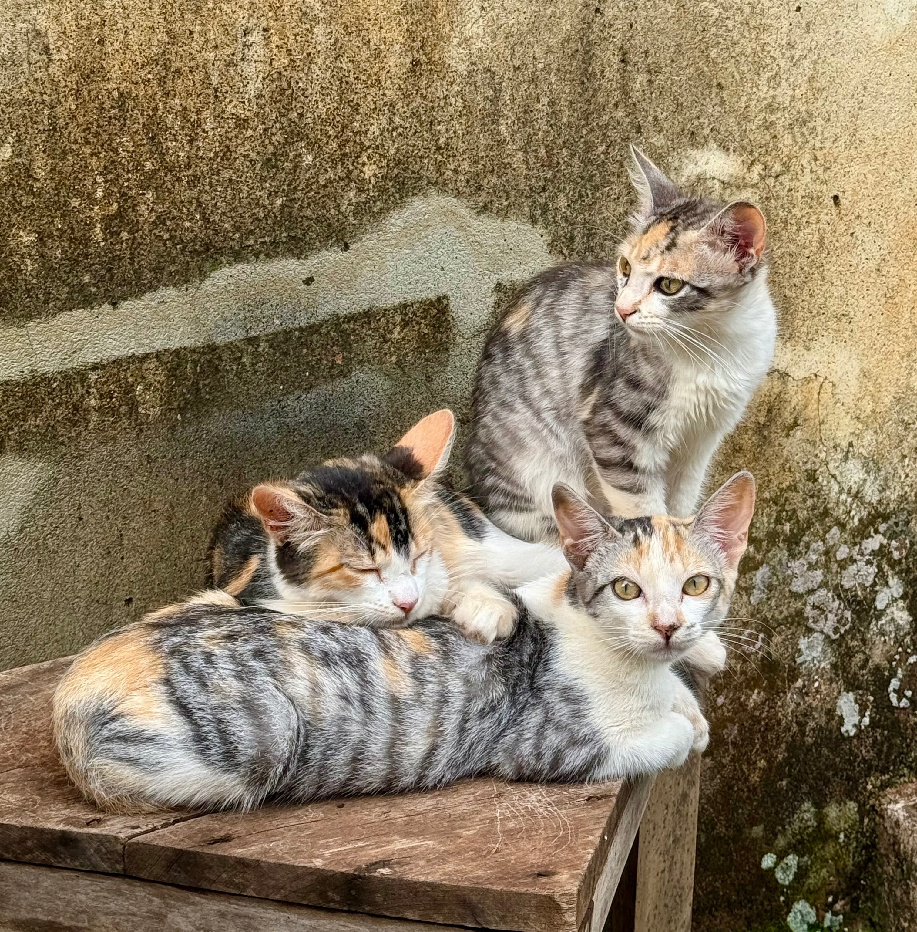 Três gatinhas tricolor filhotes e uma adulta laranja que é pura ternura! 🐾