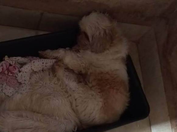 Ela é branca com caramelo,o pelo está médio,quando está suja ela fica mais escura dando a parecer que ela é totalmente caramelo,se for no pet shop tomar banho ela fica bem branquinha,quase sumindo os caramelos.