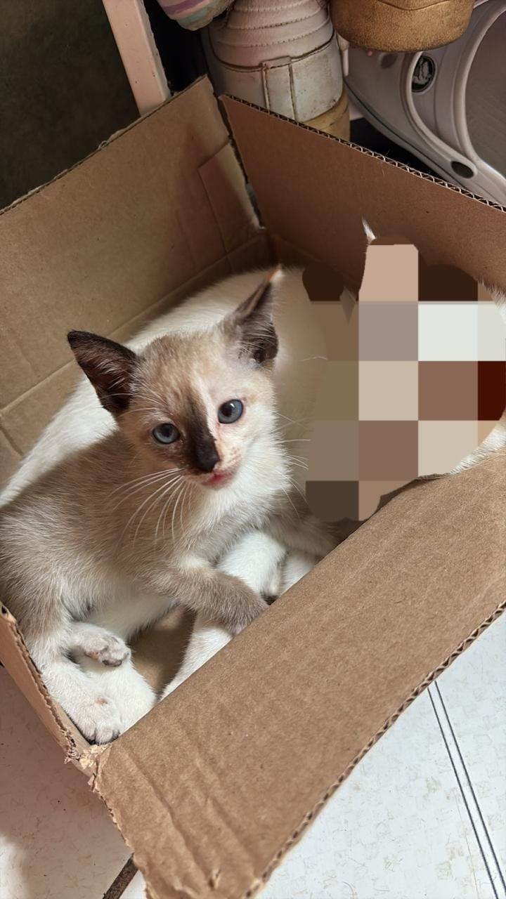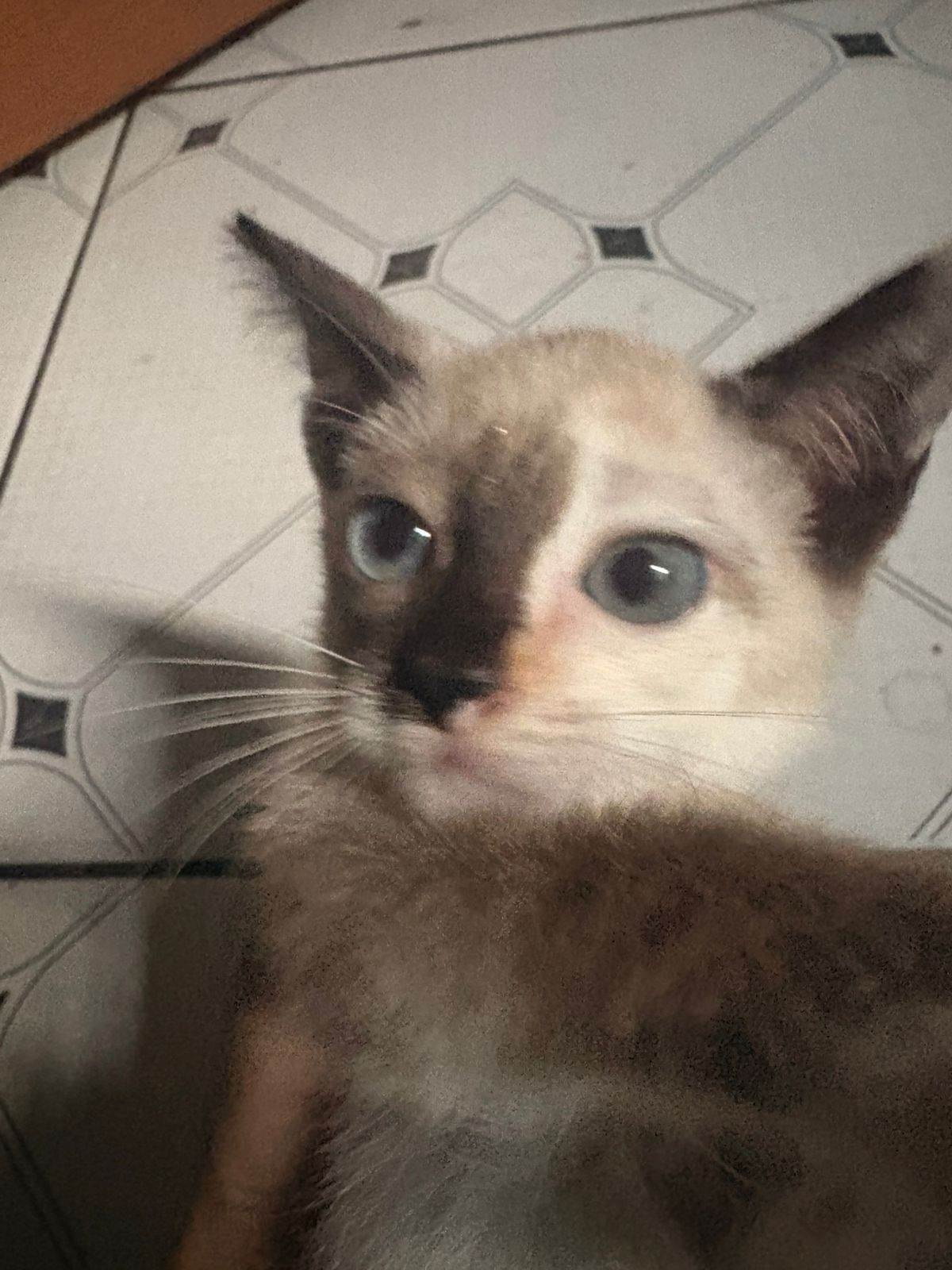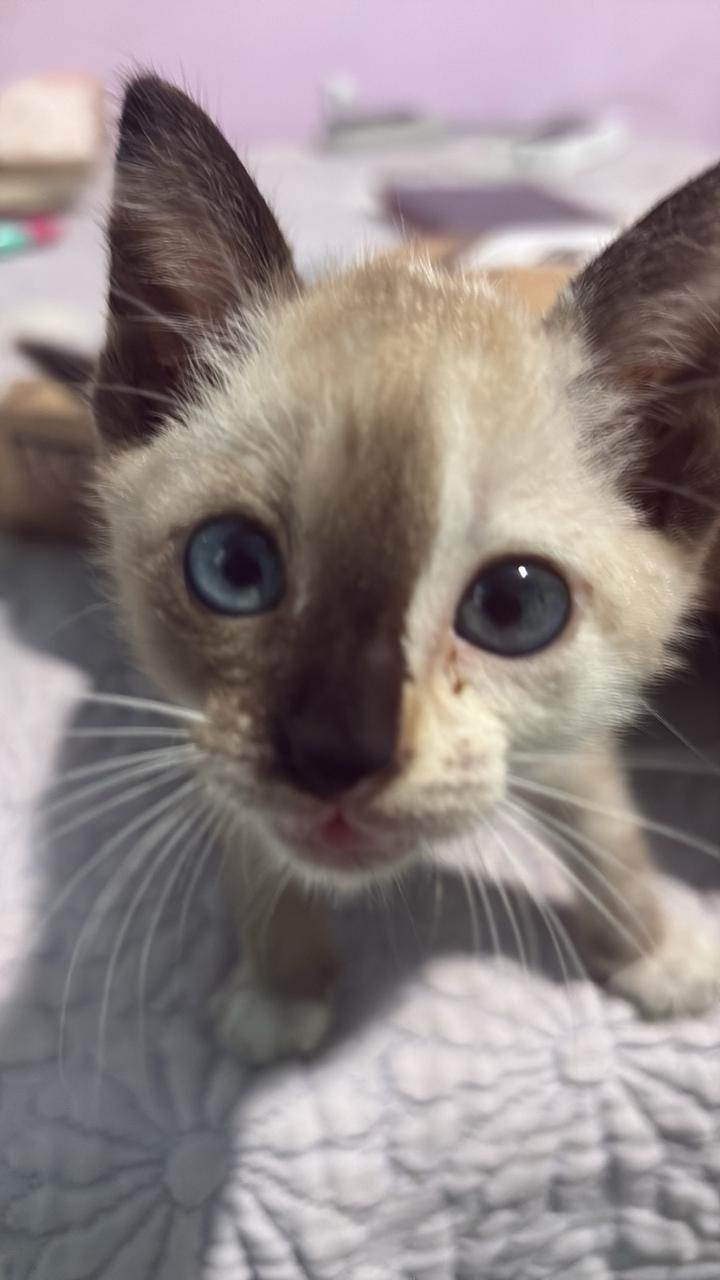 Sua pelagem é Siamês Point (tipo Siamês), usa caixinha de areia super bem.
