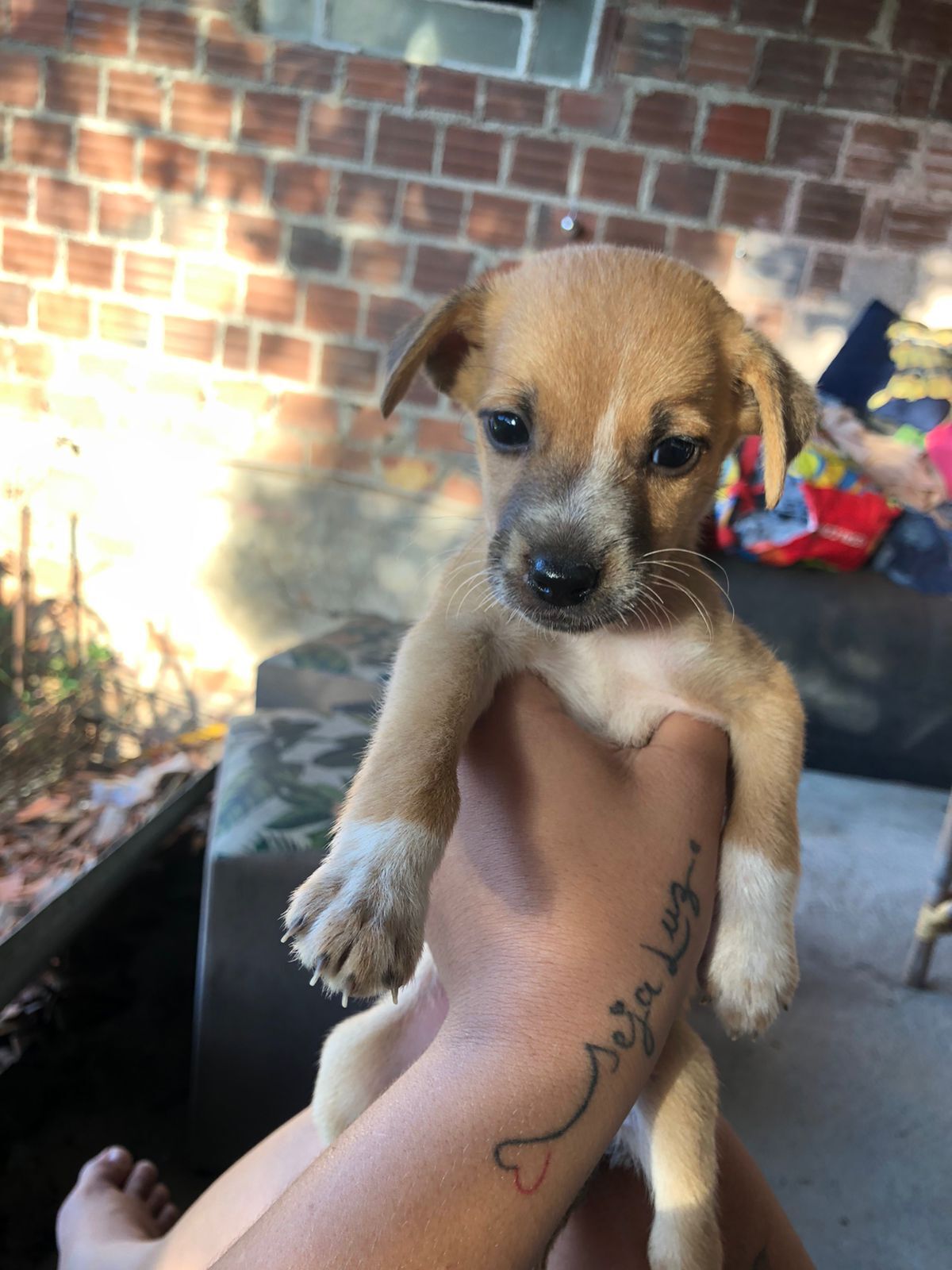 Ela tem coloração caramela e tem uma pinta branca no funcinho que é preto
