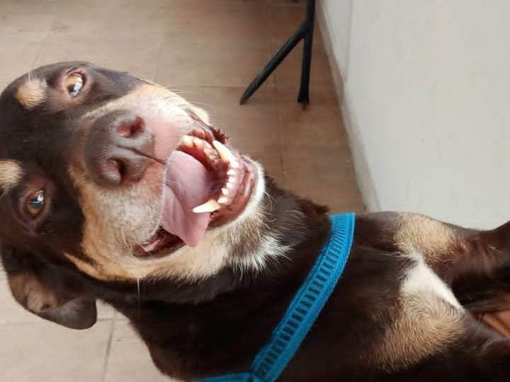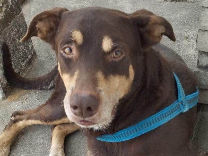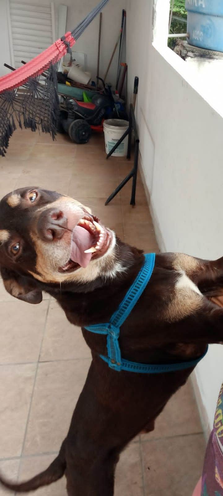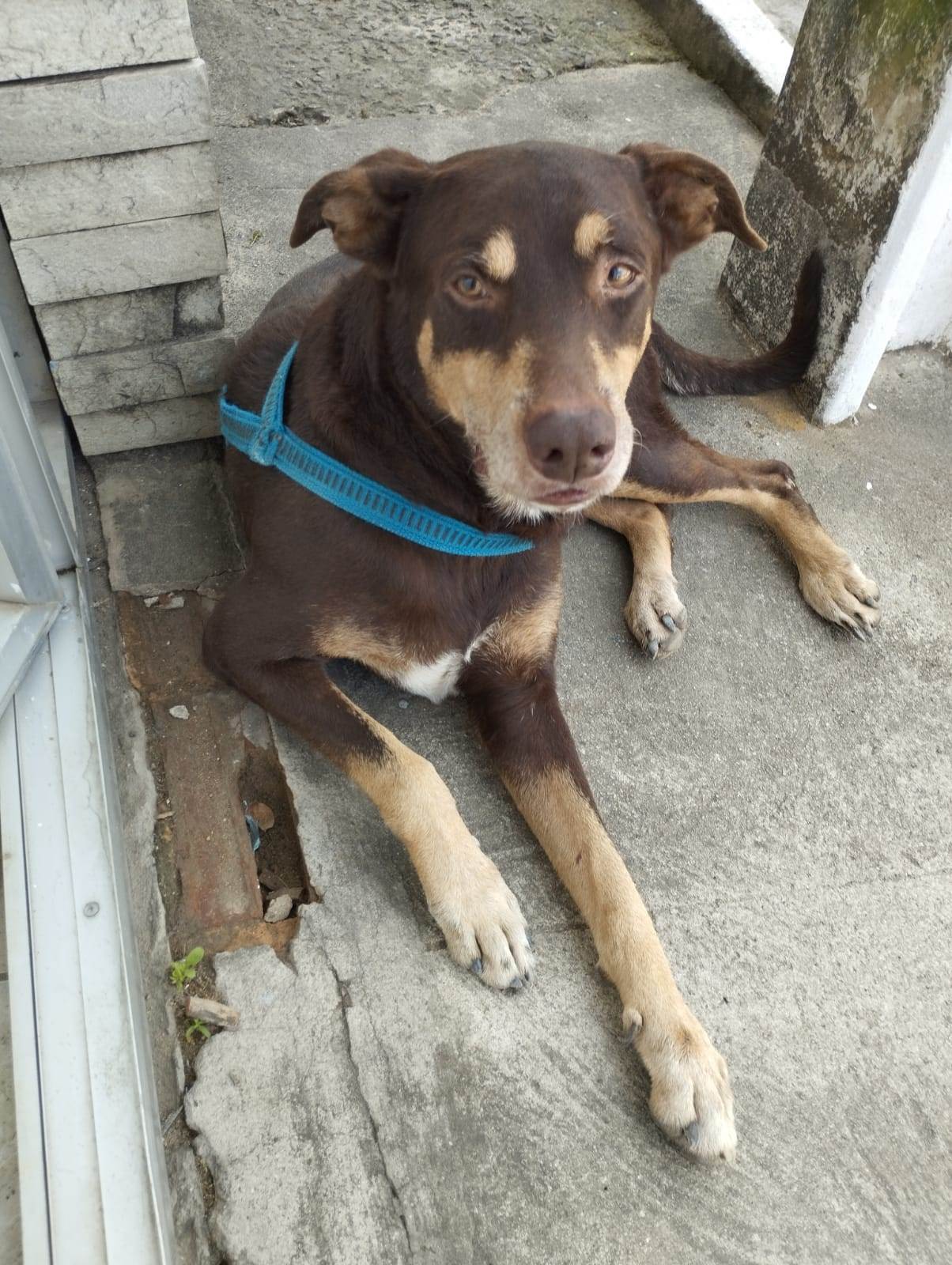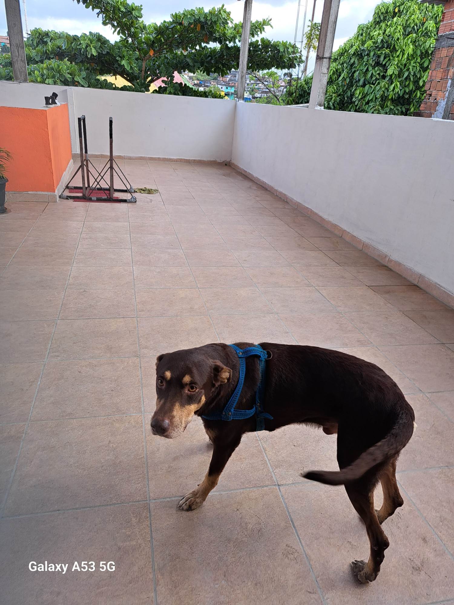 Ele foi abandonado na minha rua, muito dócil e carinhoso, ele tem tamanho de labrador. É muito bonzinho.