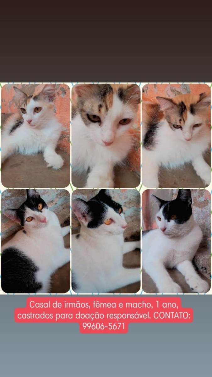 Dois irmãos macho e fêmea para doação responsável. Castrados, usam a caixa de areia para as necessidades. Somente para lares telados ou sem nenhum acesso a rua.
