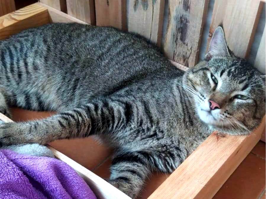 Ele fica trancado no quarto o dia inteiro, pois não pode circular pela casa devido ao estresse (tanto dele quanto dos idosos). Está em busca de um lar aconchegante telado.