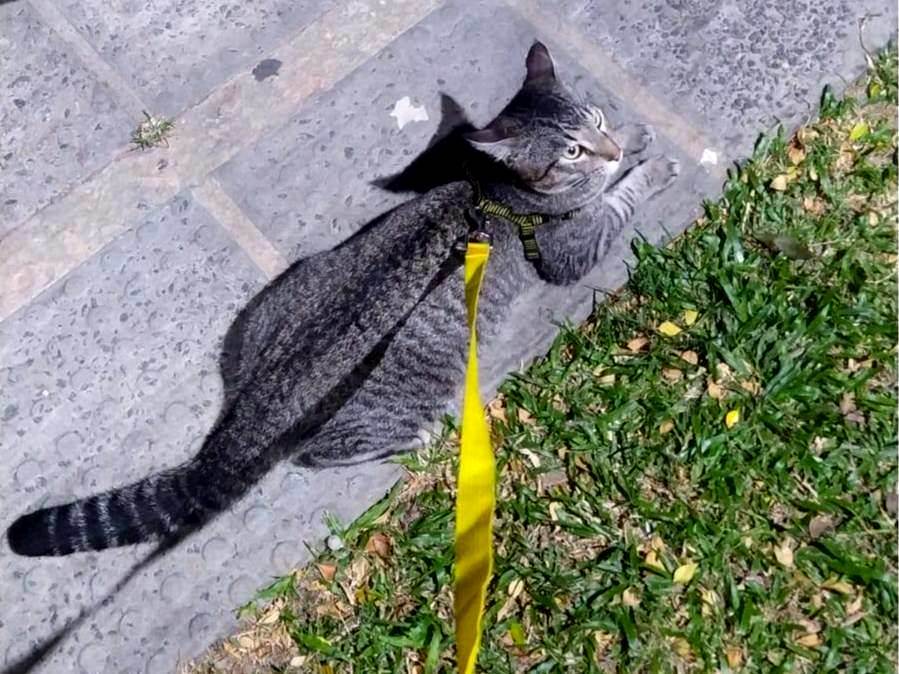 Ah, Pancinha virou amigo do gato antissocial Tufão que anda de coleira por aqui. Mostrou a barriguinha pedindo para brincar: e Tufão cedeu, mesmo sendo arisco.