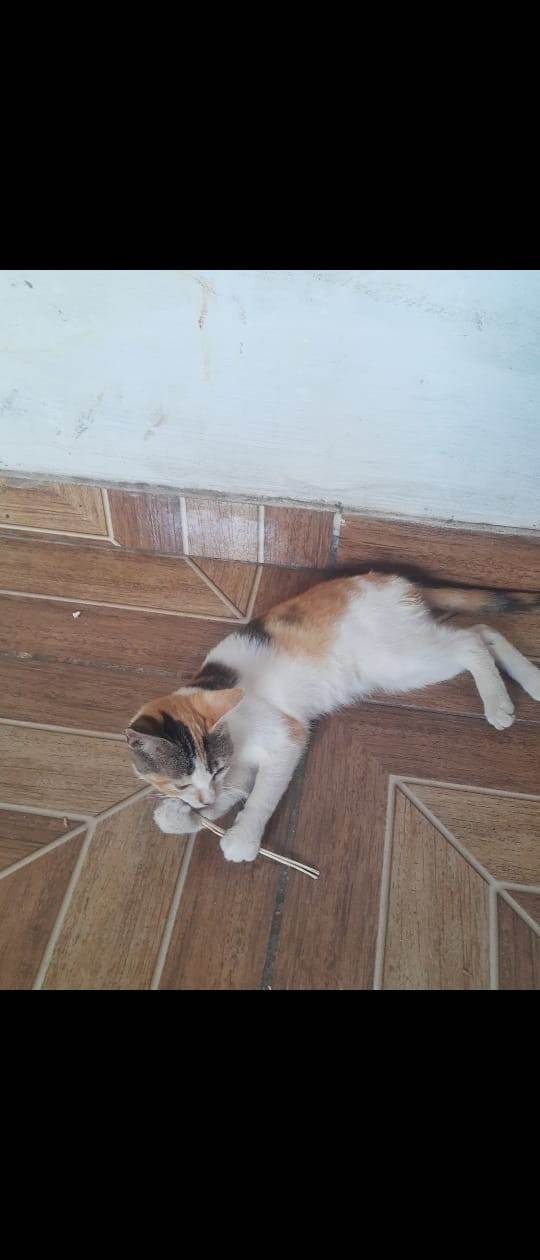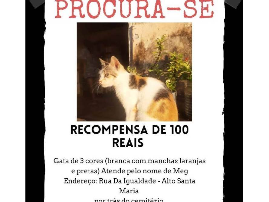 Meg  Fêmea   Raça: Exótico  Porte: Medio   Idade: 2 anos Pelagem: Branca/Preta    Perdido em: 15/08/2025 A gata é tricolor:Branca com pintas amarelada ou laranjada e pistas pretas