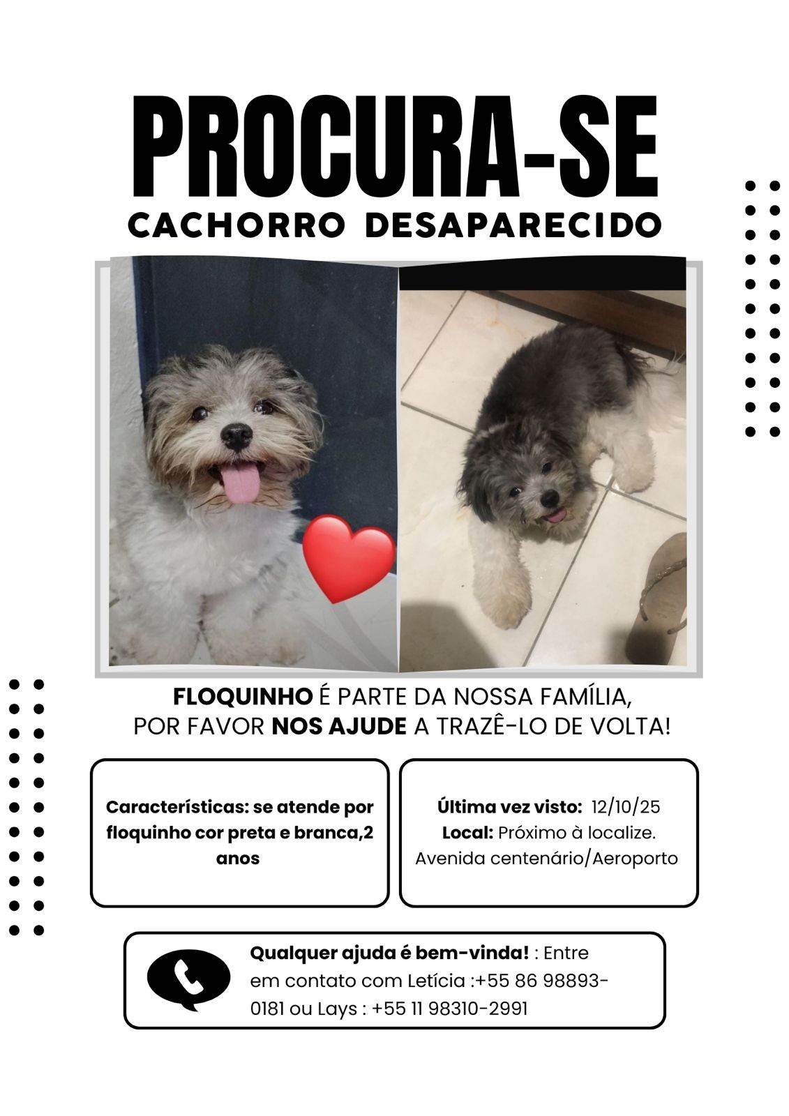 O floquinho sumiu no domingo 12/10 por volta das 19:12, ele foi visto pela última vez na Avenida Centenário, algumas pessoas relataram que tinha uma moça que aparentemente fazia entrega tentando pegá-lo para ajudar.