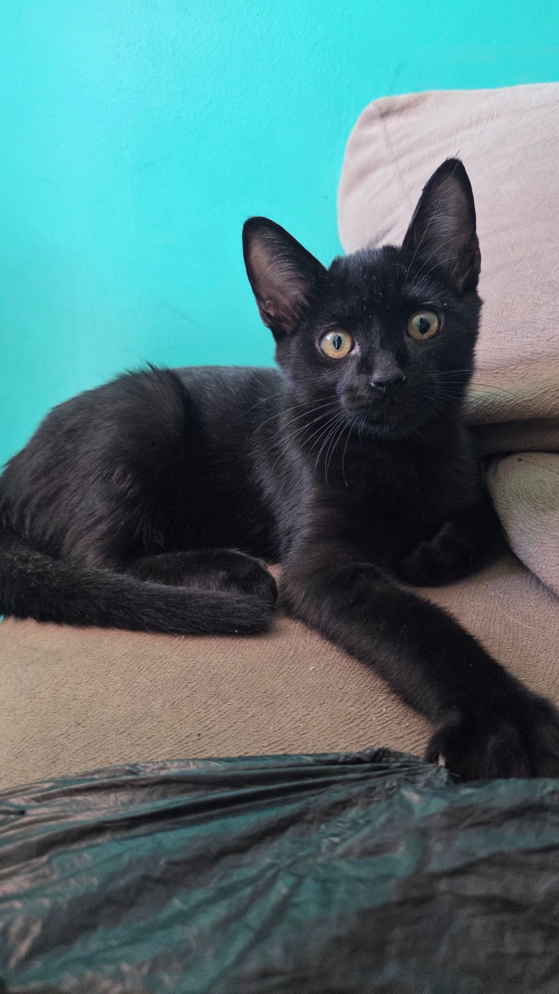 Três gatinhos filhotes de uma ninhada de uma gata frajola com gato rajado, nasceram duas fêmeas e um macho, uma fêmea é rajada, outra é parcialmente branca e parcialmente rajada, e o único macho tem a pelagem preta, todos tem os olhos amarelos, são calmos, dóceis e muito brincalhões, nasceram no dia 10 de dezembro de 2025.