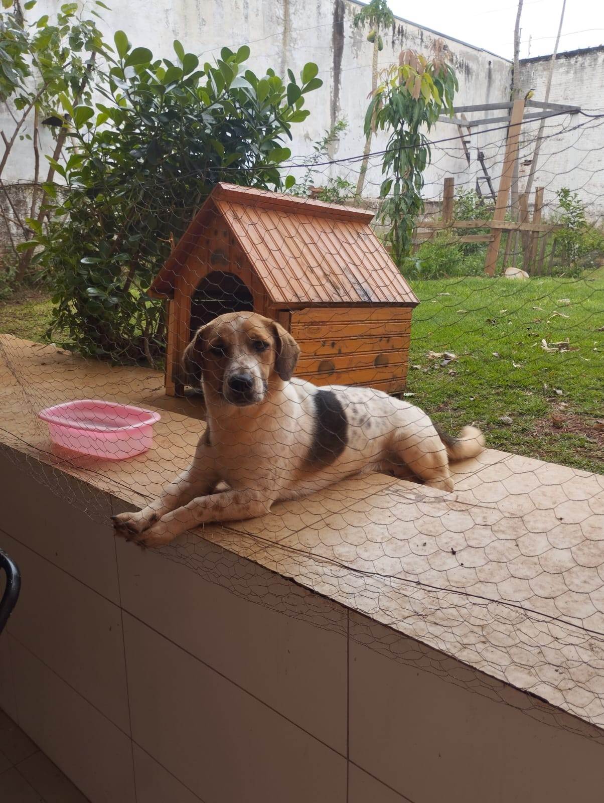 Ele é branco com mancha marrons e preta, muito dócil ele tem 1ano .
