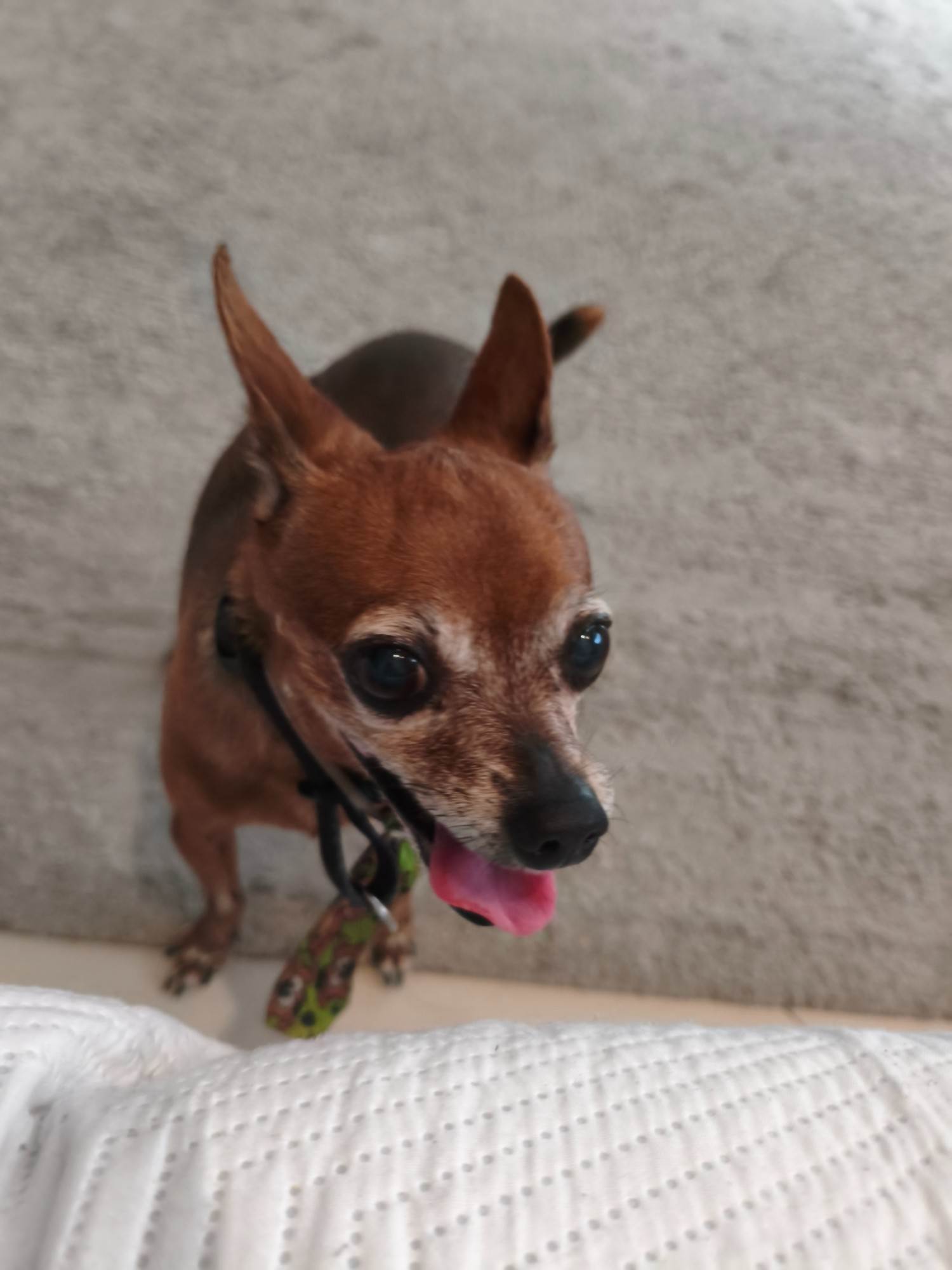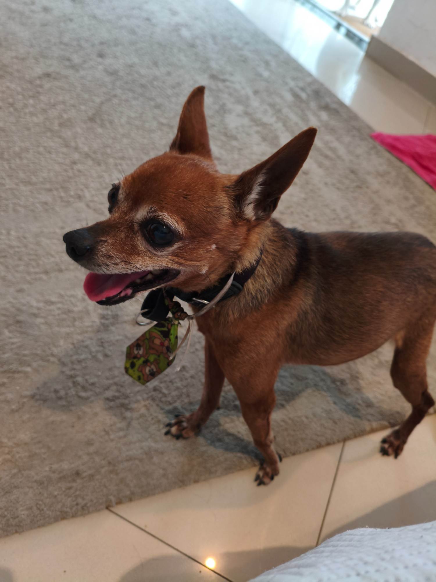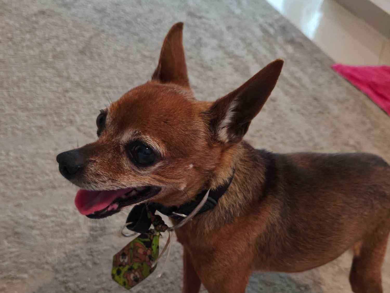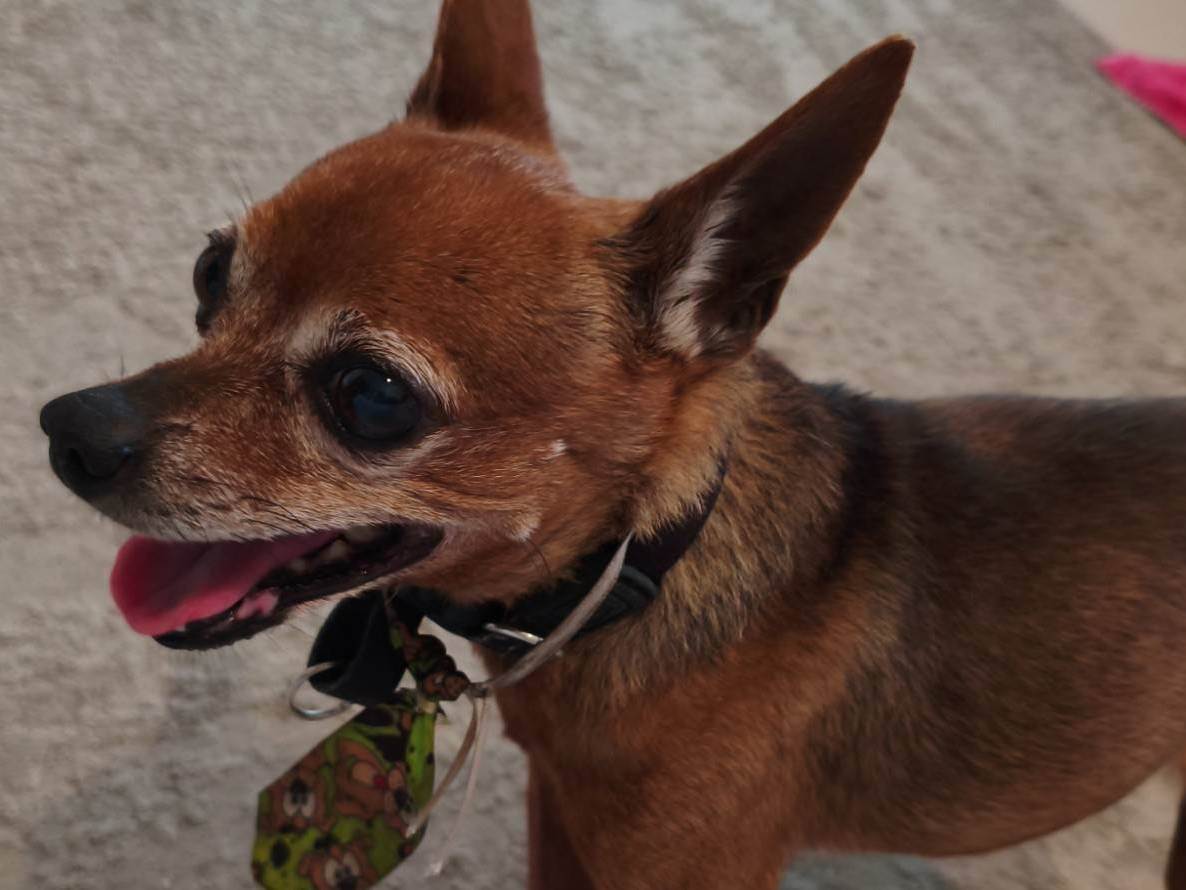 Pinscher idoso encontrado no bairro Portinho em Cabo Frio, próximo ao centro municipal de reabilitação.