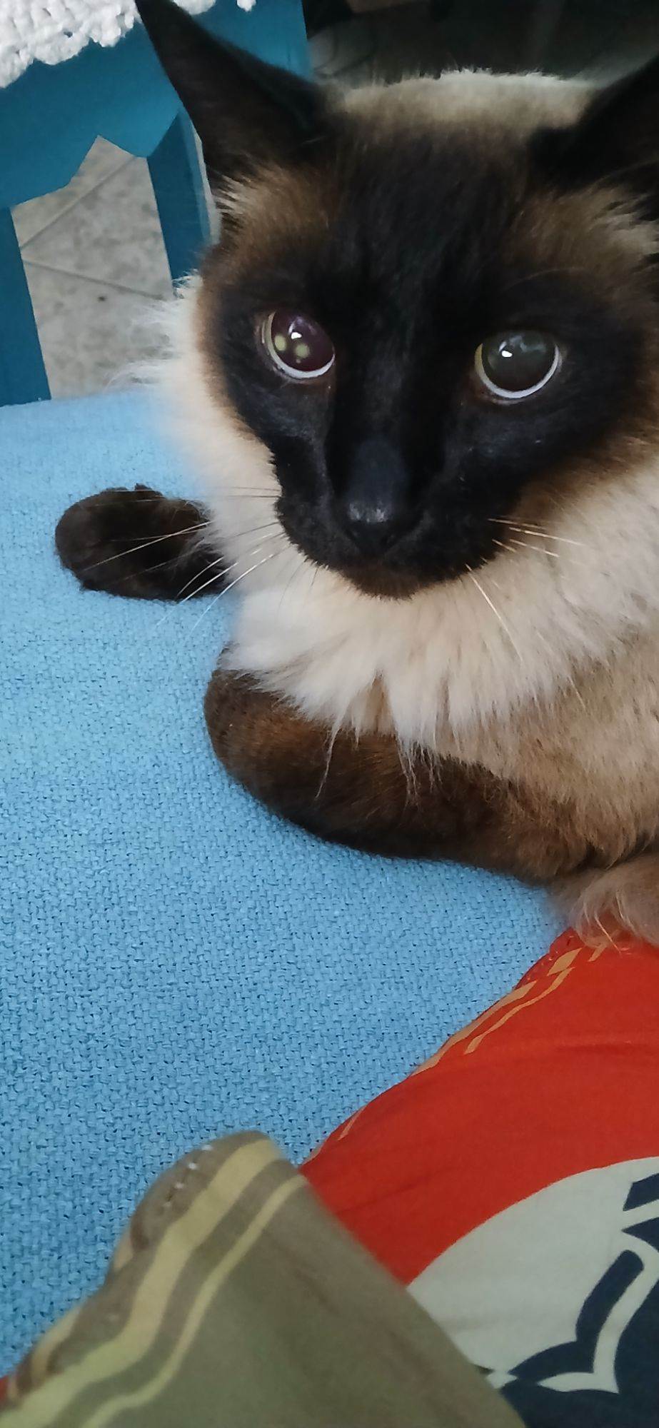 Gato siamês macho castrado adulto postulado a fazer duas necessidades na caixinha de areia.