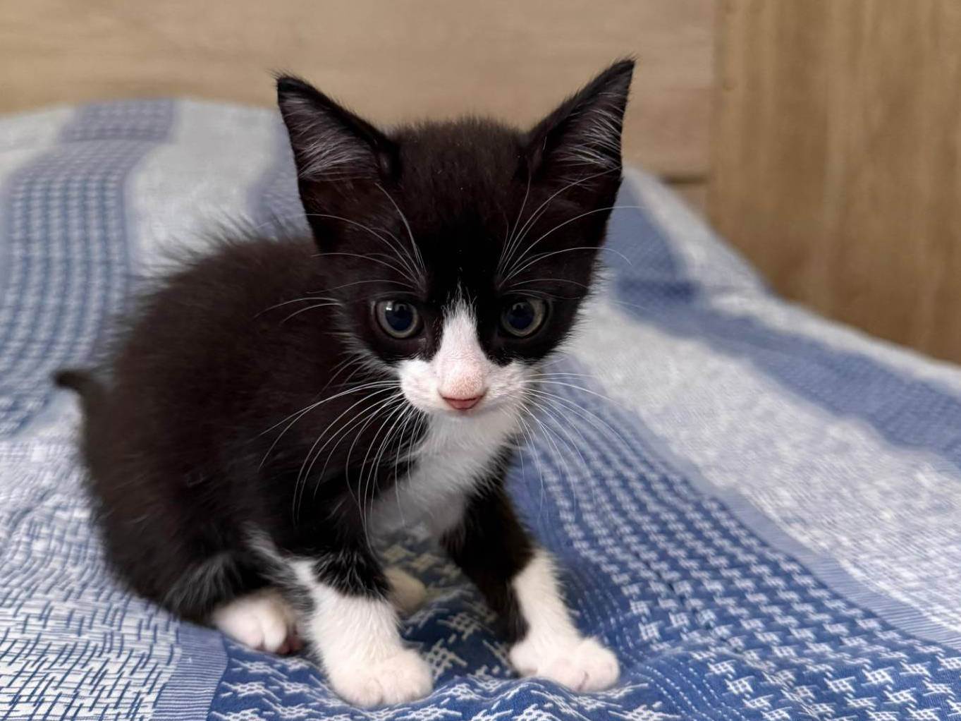 Filhote com pelagem preta e branca, muito dócil e brincalhona