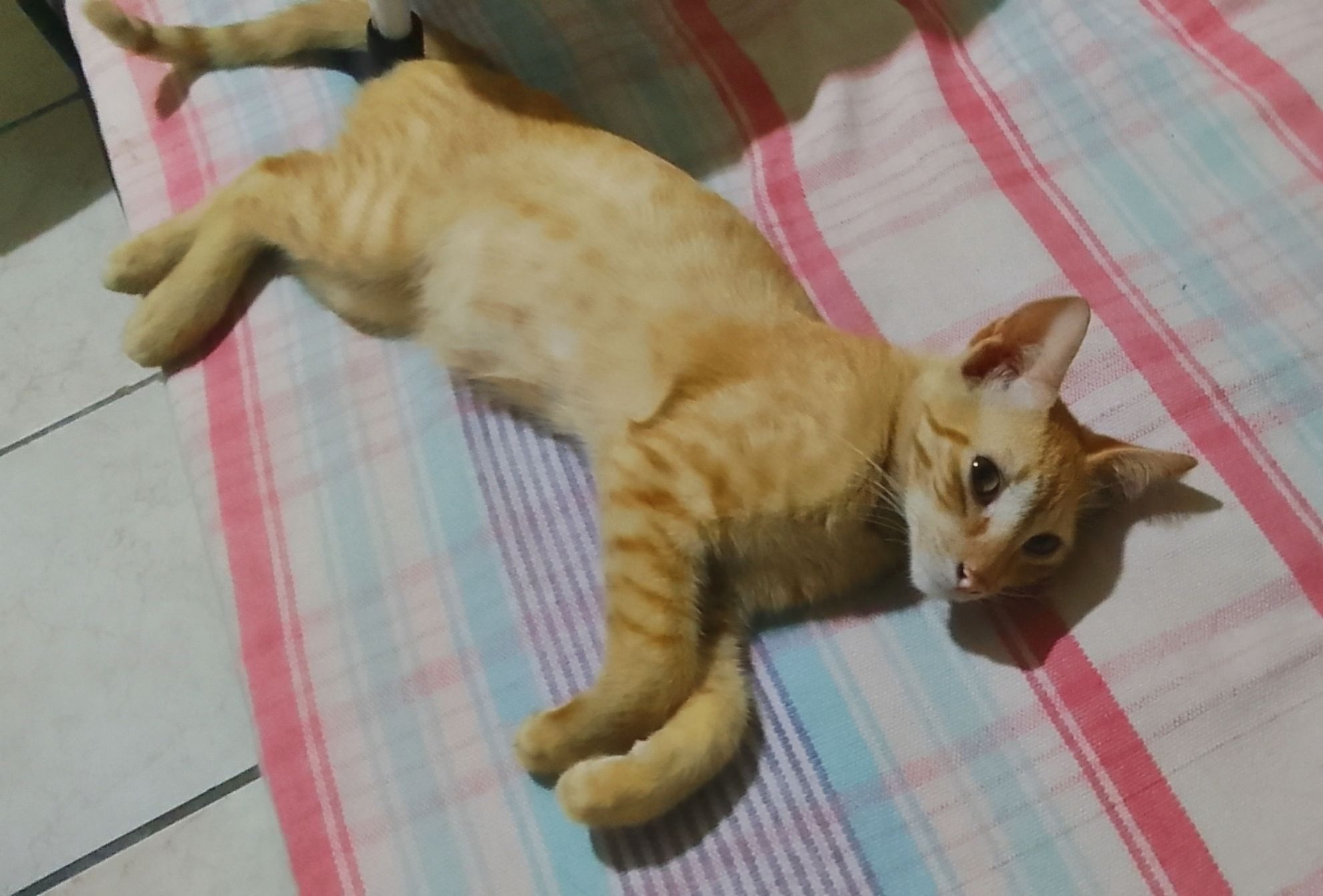 O Laranjinha tem 5 meses, macho, veio de uma ninhada de uma gata que "invadiu" nossa casa. Desde sempre demonstrou ser uma gato muito amigável, extremamente carinhoso, ele adora deitar em cima de outros gatos ou mesmo no seu pé.