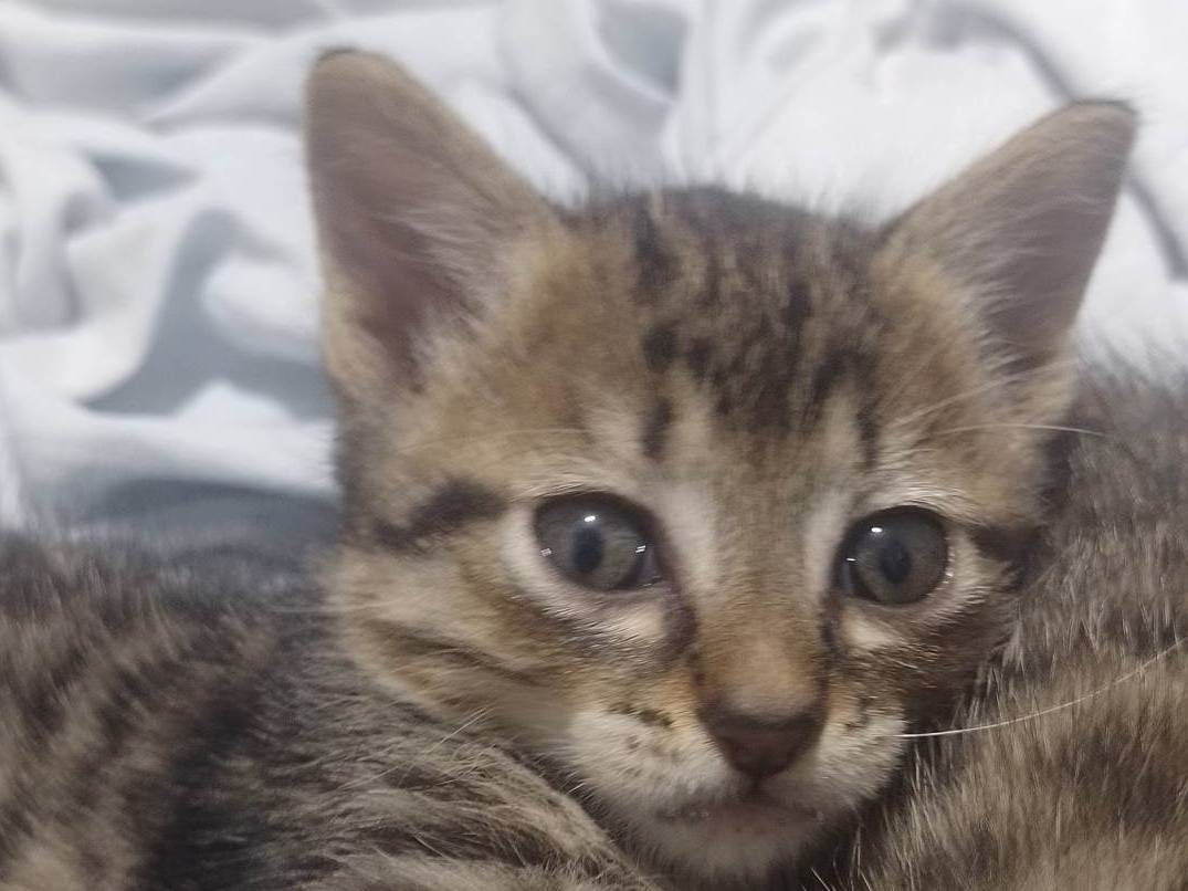 Gato macho com pelagem rajada e um rabo com uma ponta branca. Bastante ativo e gosta de brincar com as irmãs.