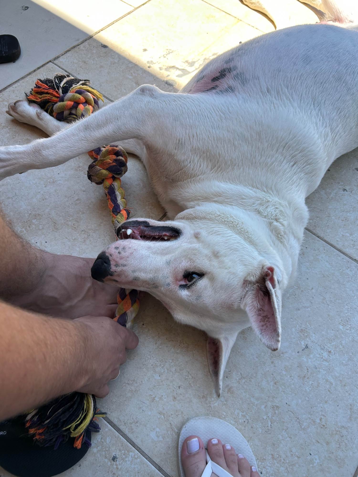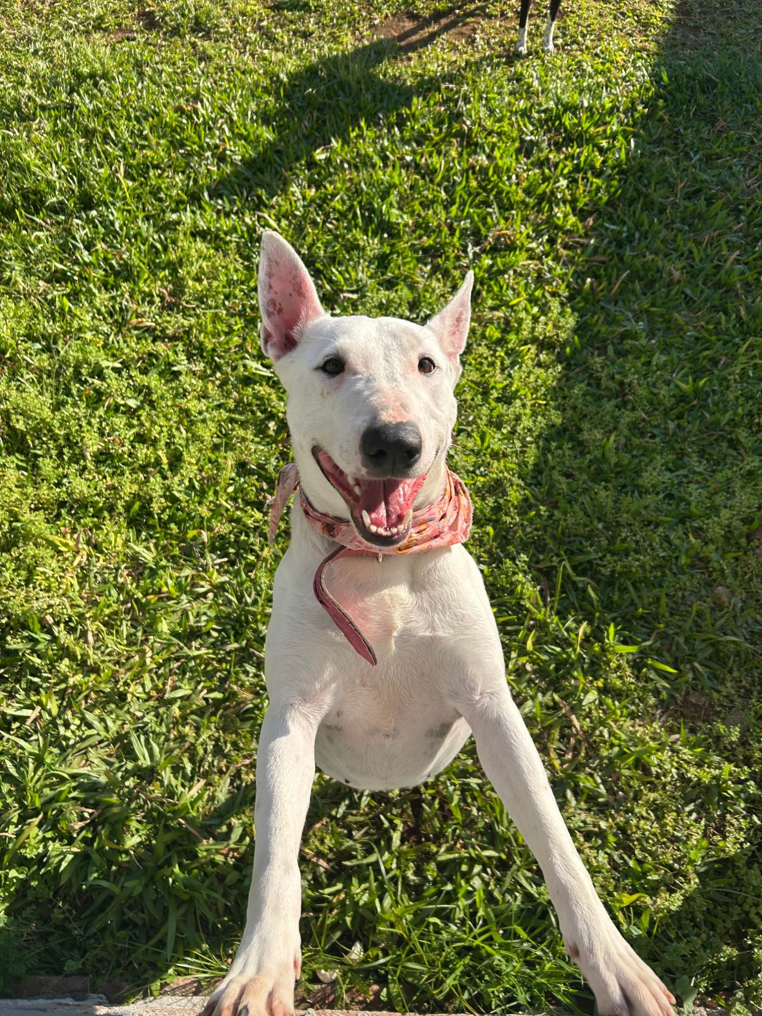 Gaia é uma mistura de pitbull com bullterier, é uma doce de cadela, adora brincar, procuramos por um novo lar ou lar temporário.