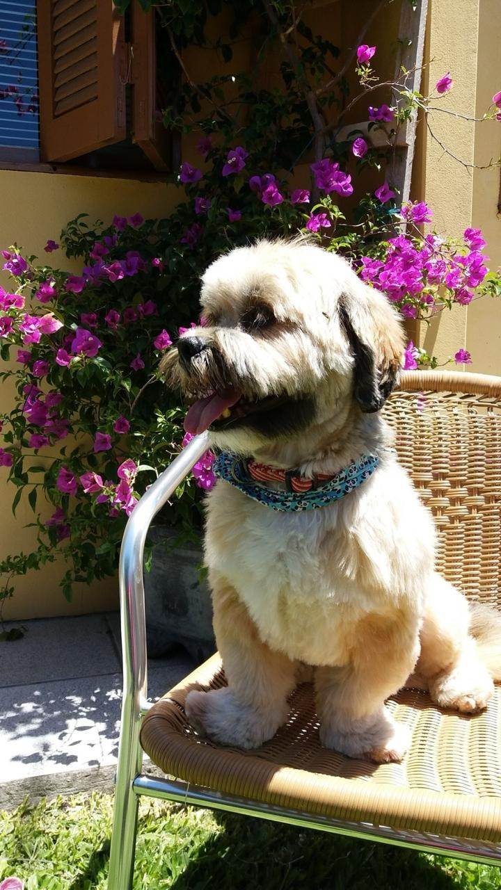Tibet é um cão saudável, feliz e com energia. Se alimenta de ração, toma banho tanto em casa quanto na PET, adora passear de carro e ganhar carinho
