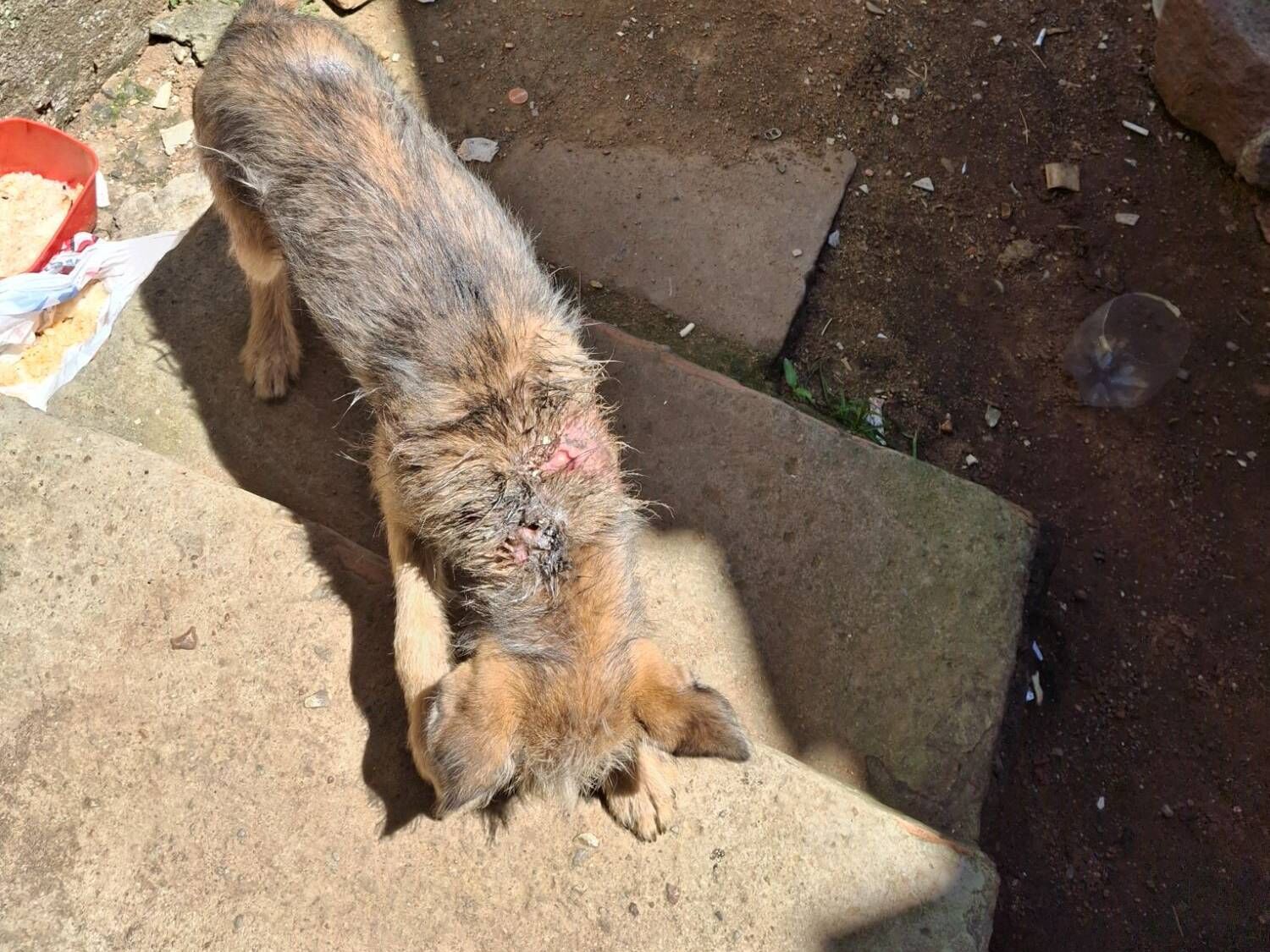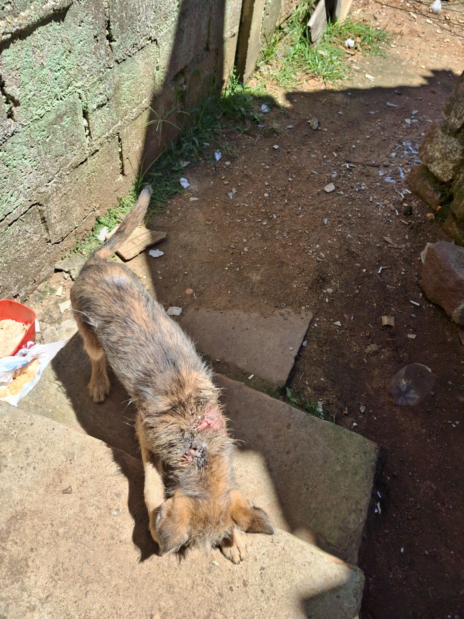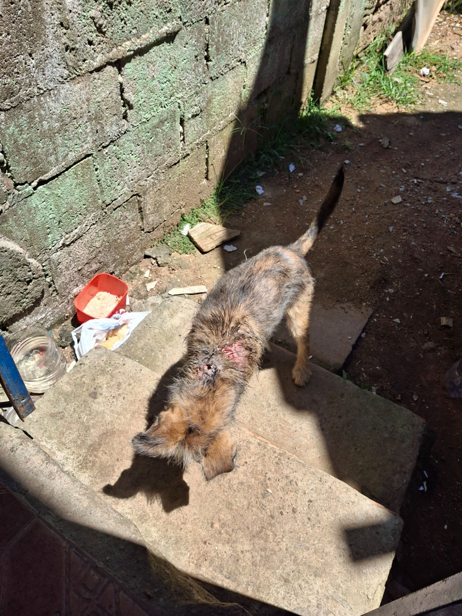O meu irmão foi embora para Santa Catarina e deixou o cão abandonado o cão apareceu aqui muito mal tive do dei alimento mas o cão veio veio de ferimentos esta com bicheira tentei colocar remédio que arrumei emprestado mas ele não deixa ninguém ter contato com ele não tenho como cuidar dele trabalho dia inteiro ele não sai daqui e fica na rua .