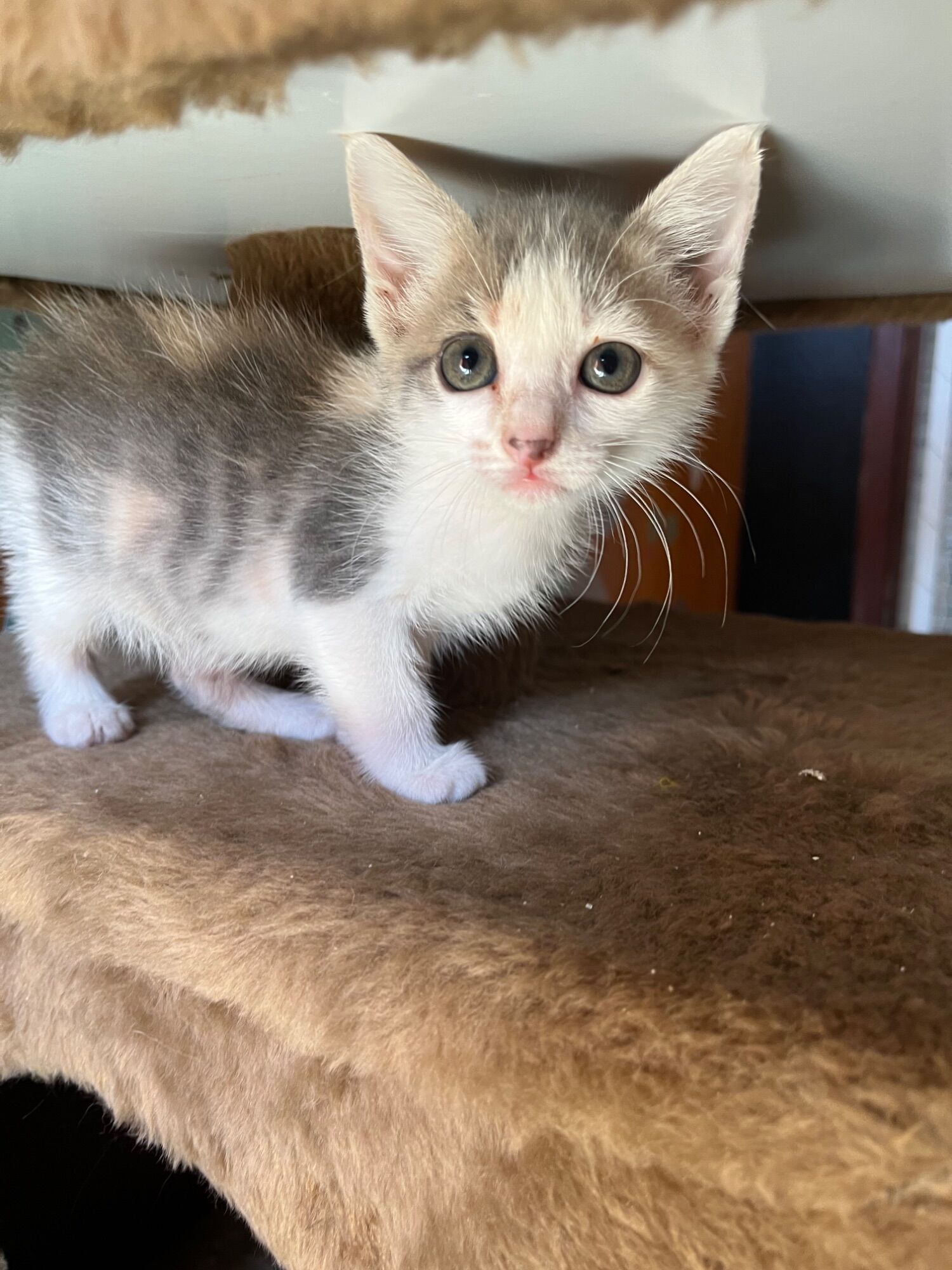Feminha tricolor , está com 50 dias. Tranquila e afetiva. Teste, vacinas e castração por conta do adotante. Indispensável redes de proteção nas janelas.