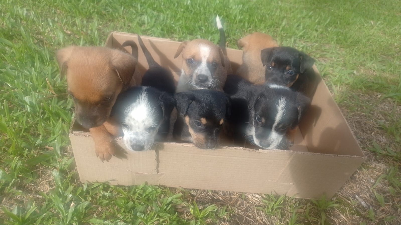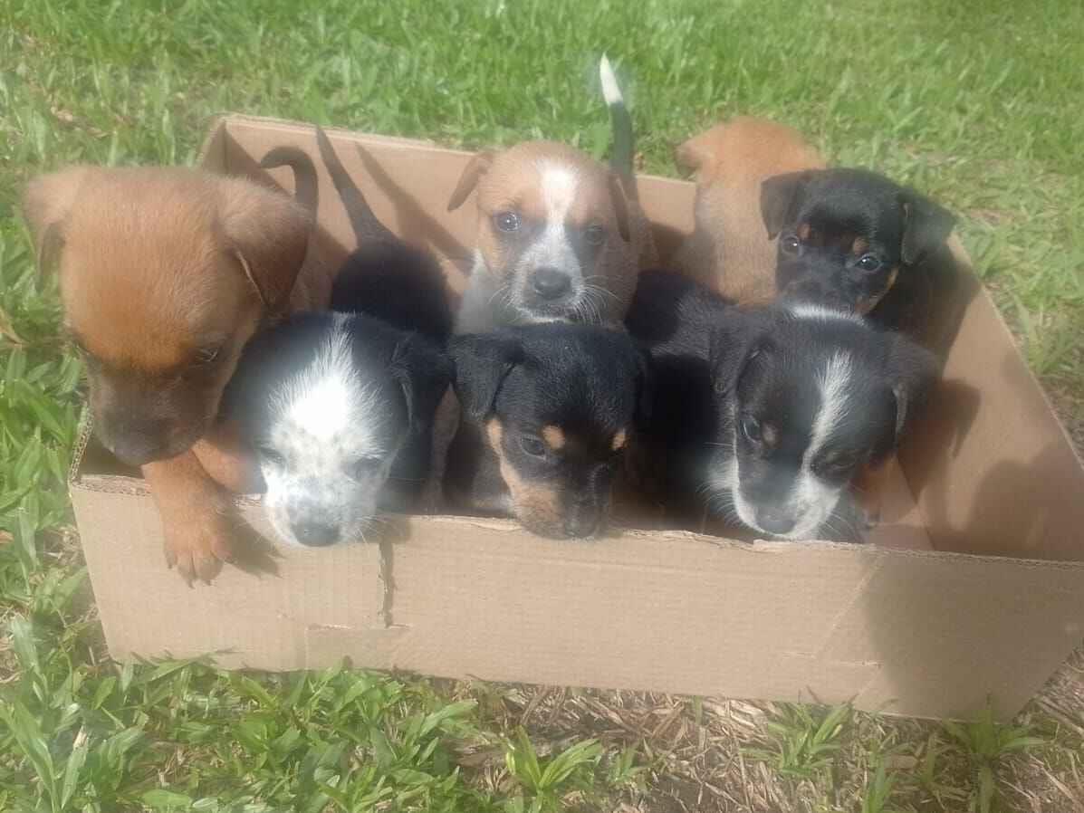 Grupo de 7 filhotes de cachorro, 3 machos e 4 fêmeas. Pequenos, não vão crescer muito, pelagem mista entre marrom, preto e branco.