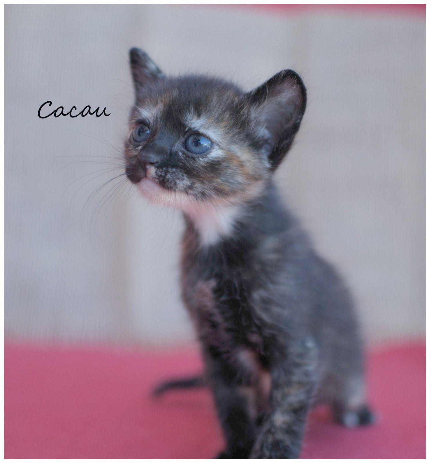 Cacau é uma gatinha escaminha escura muito dócil e querida. Ela nasceu no natal e é a ultima da ninhada. Sempre procura companhia, é muito brincalhona e tem lindos olhos.