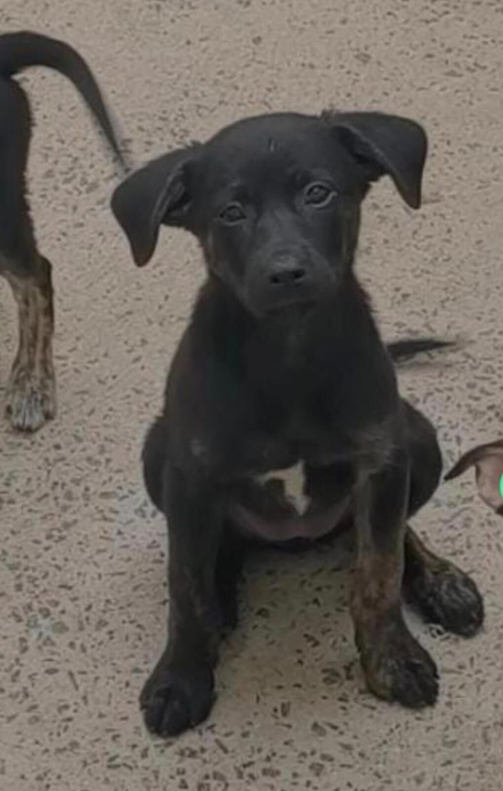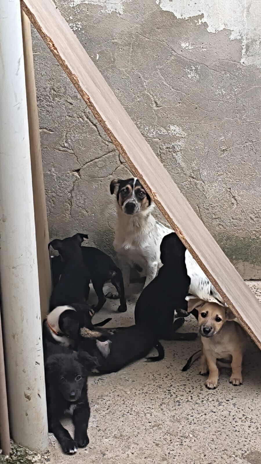 Tenho cinco filhotes pequenos de apenas 3 meses (nascimento 5/nov/25) com pelagem preta, branca. Eles são da raça vira-lata e são dóceis e brincalhões.
