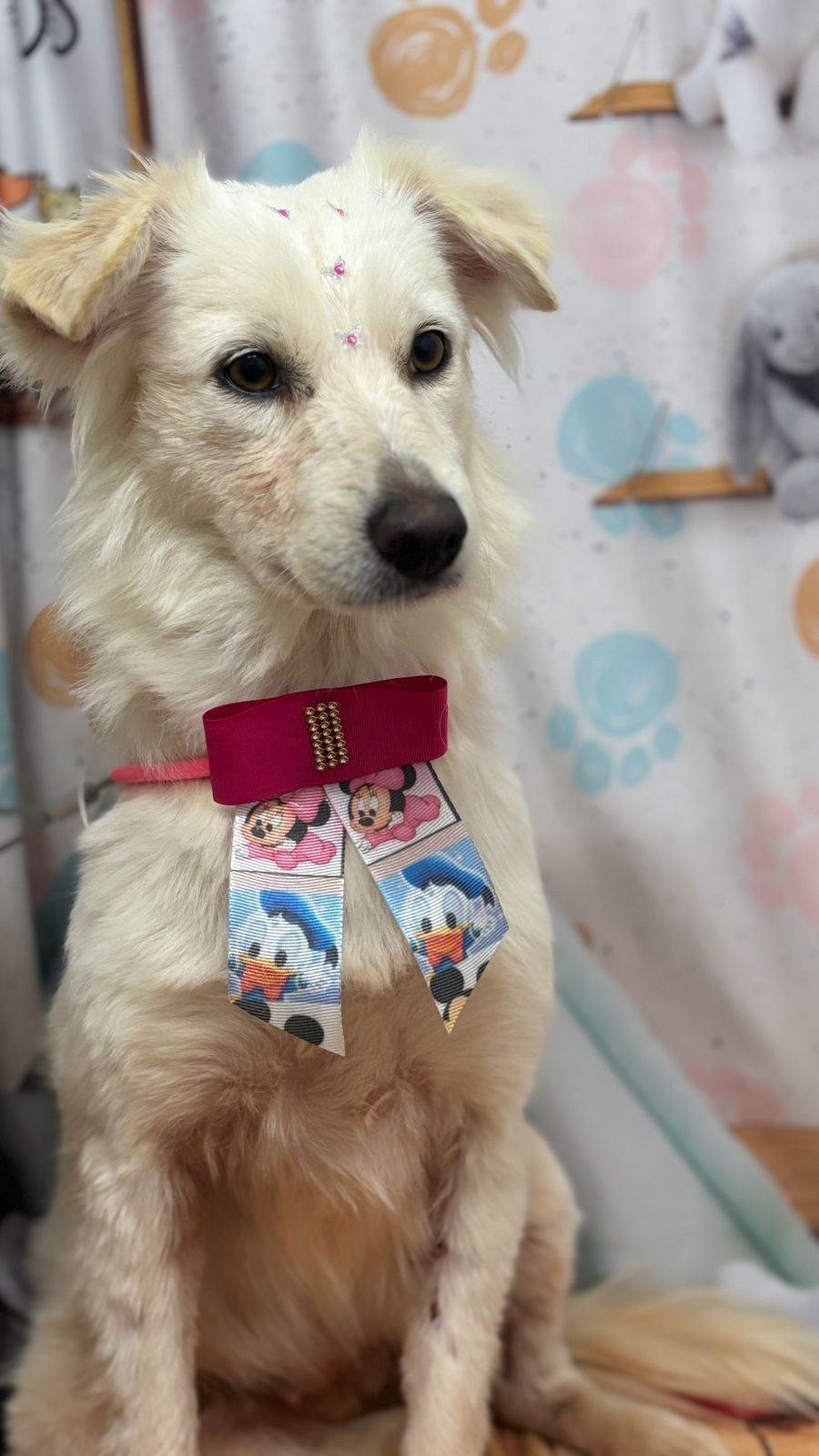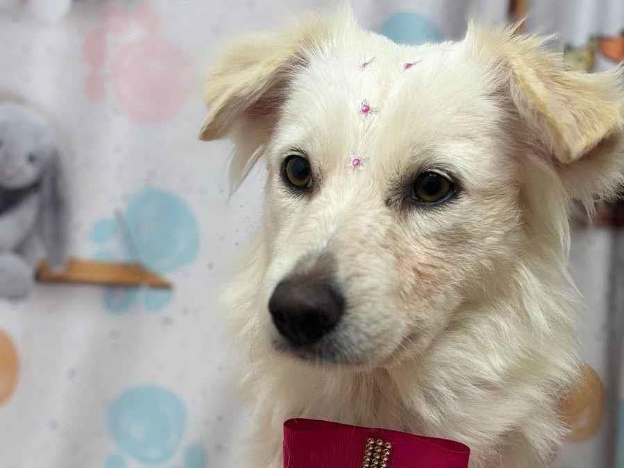 Cachorrinha dócil resgatada das ruas pois era constantemente maltratada por moradores.
