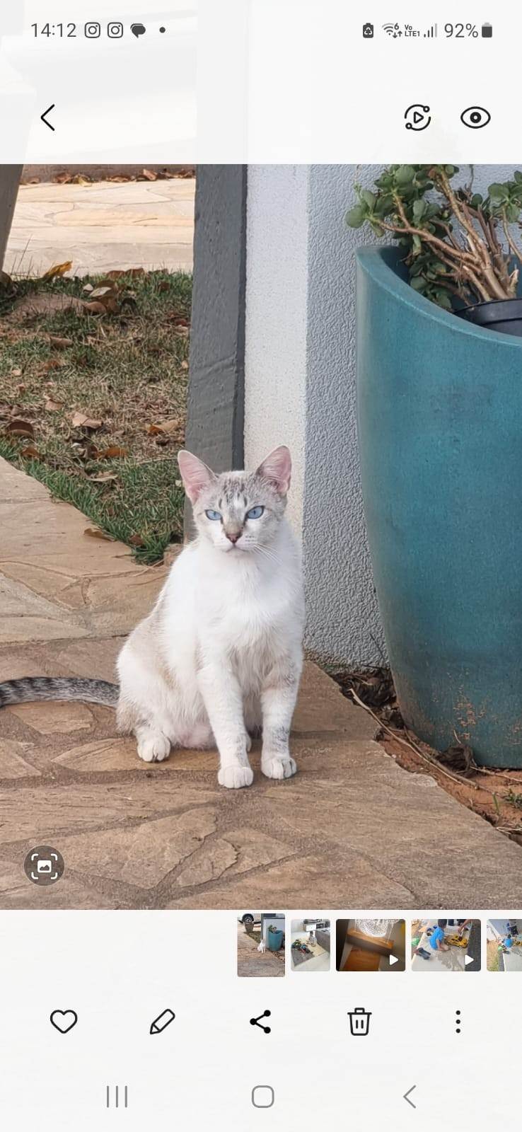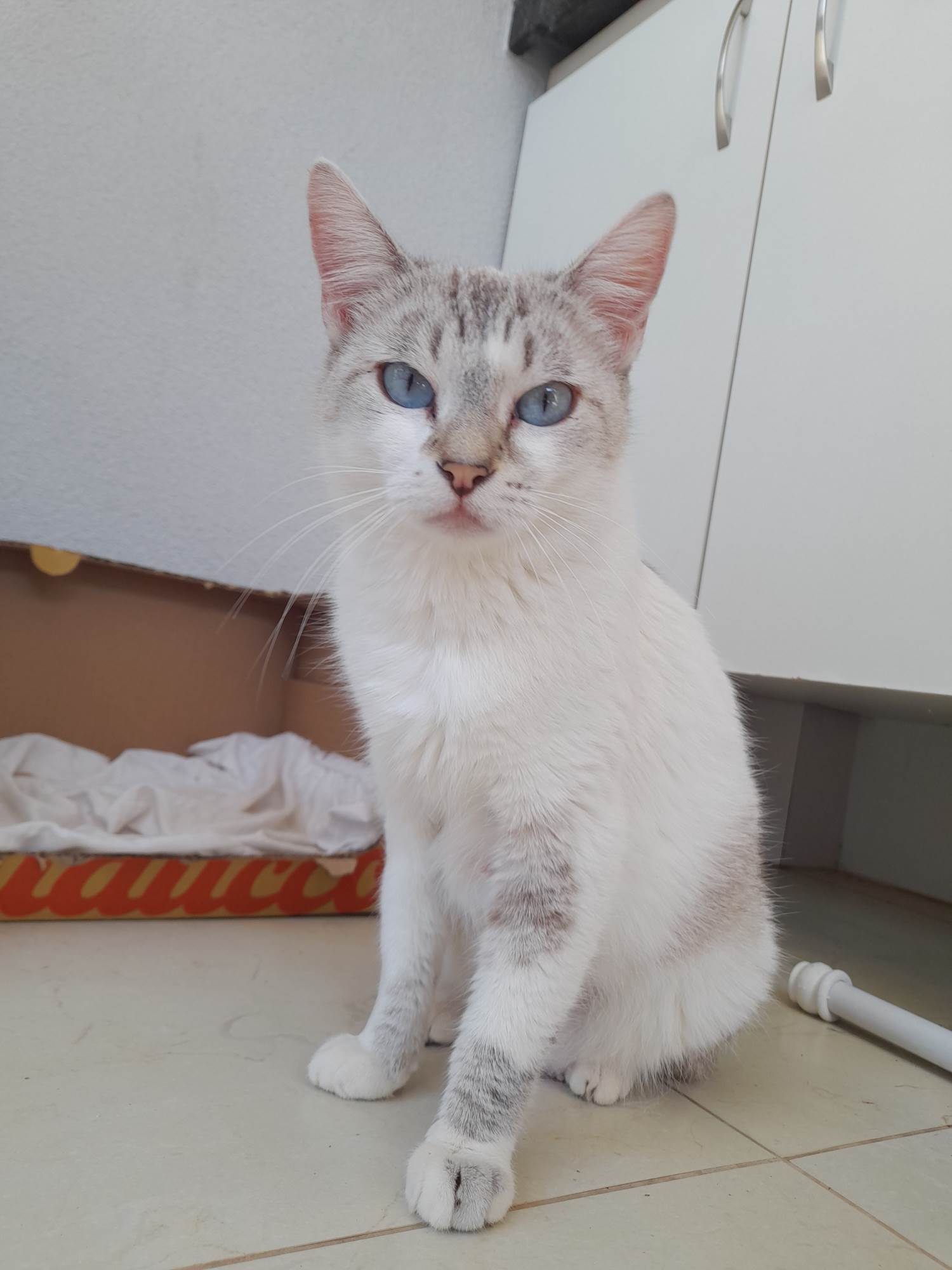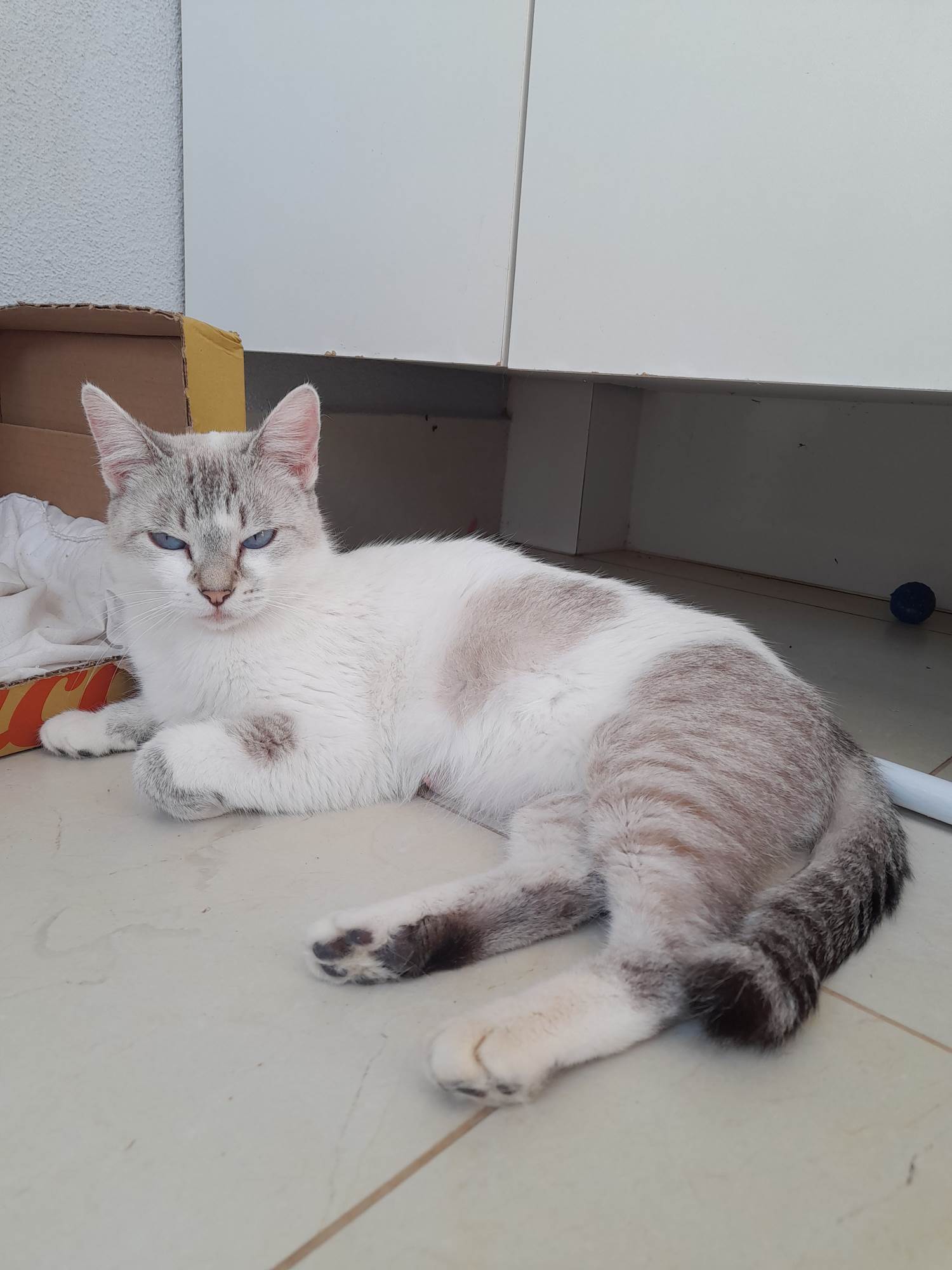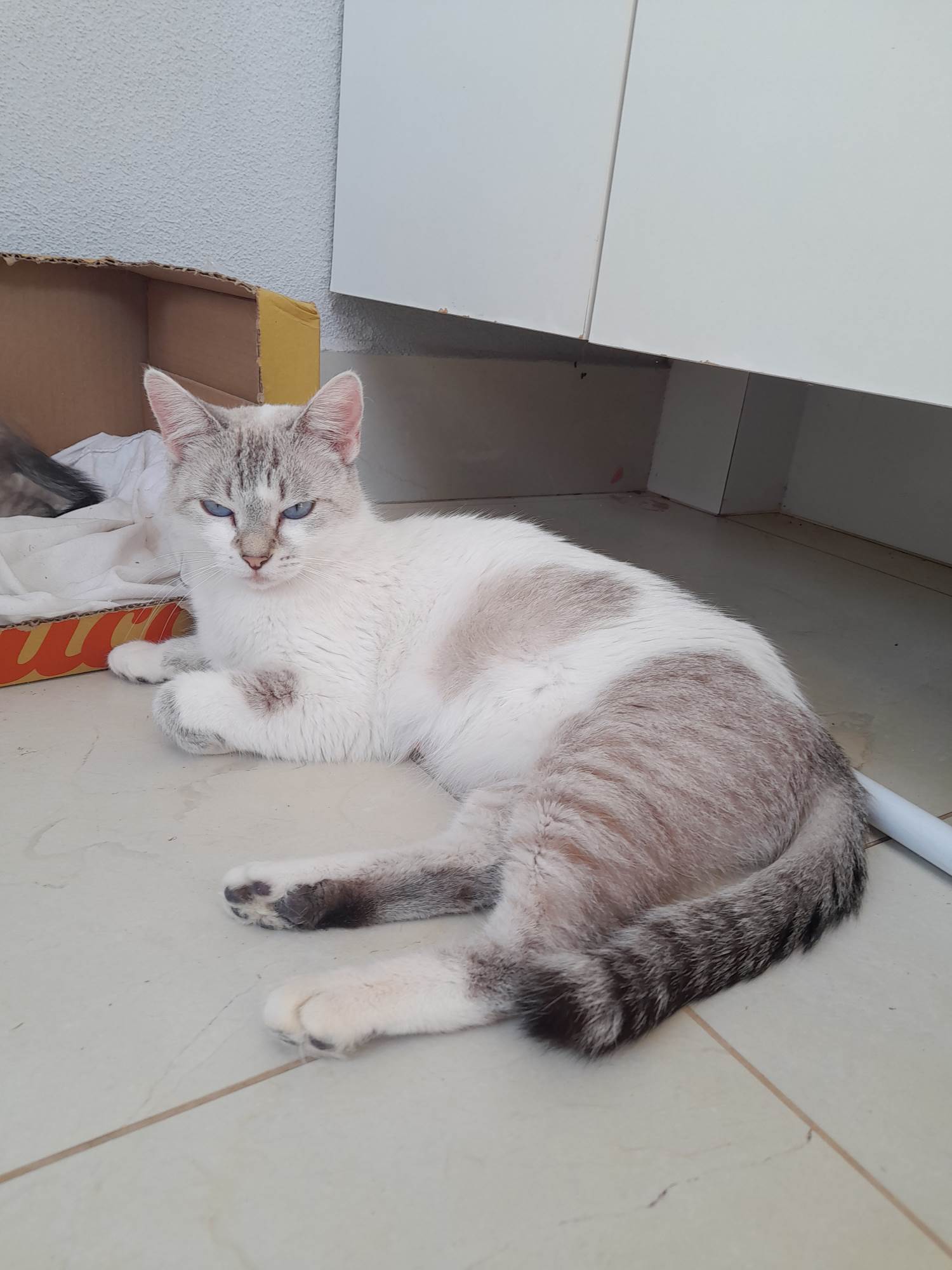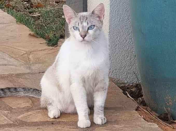 Encontramos ela abandonada em um terreno em obra, embaixo de um monte de madeira, com filhotes. Doamos os filhotes, castramos ela e agora procuramos um lar.