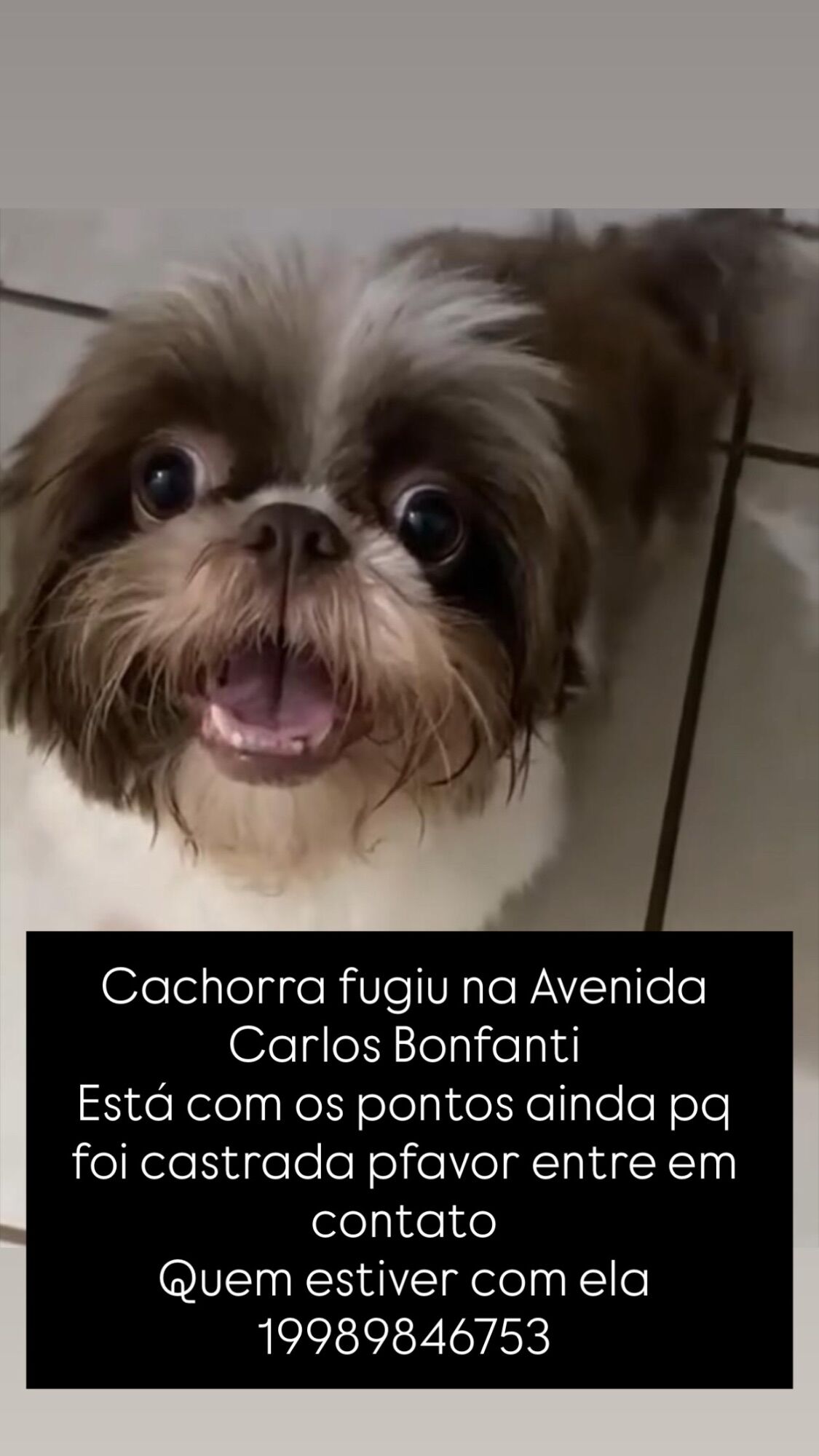 Estou em busca da minha cachorrinha, Cacau, que desapareceu no dia 1º de março de 2026. Ela é uma Shih Tzu de pelagem marrom e branca, tem apenas 1 ano de idade e é de porte pequeno. Cacau é castrada e possui um temperamento dócil e amoroso. Ela adora brincar e socializa muito bem com outros gatos, cães e crianças.