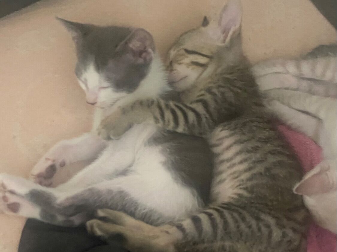 Encontrei perto da minha casa, eles estavam com a mãe, são 2 filhotes, 1 deles branco com preto (macho) e a outra rajada (fêmea)