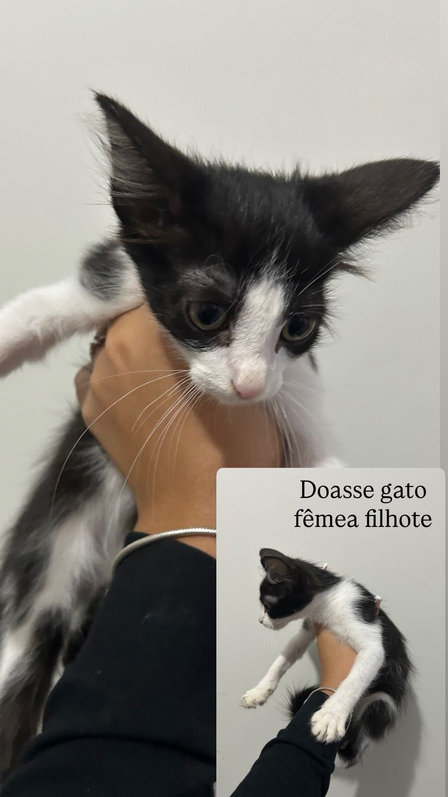 Esta é uma adorável gata SRD de pelagem branca e preta, com idades entre 2 e 6 meses. Ela é pequena e cheia de energia, pronta para encontrar um lar acolhedor. Seu temperamento é amigos e curioso, sempre explorando novos ambientes e fazendo novos amigos. Adora brincar com brinquedos, perseguir penas e se esconde