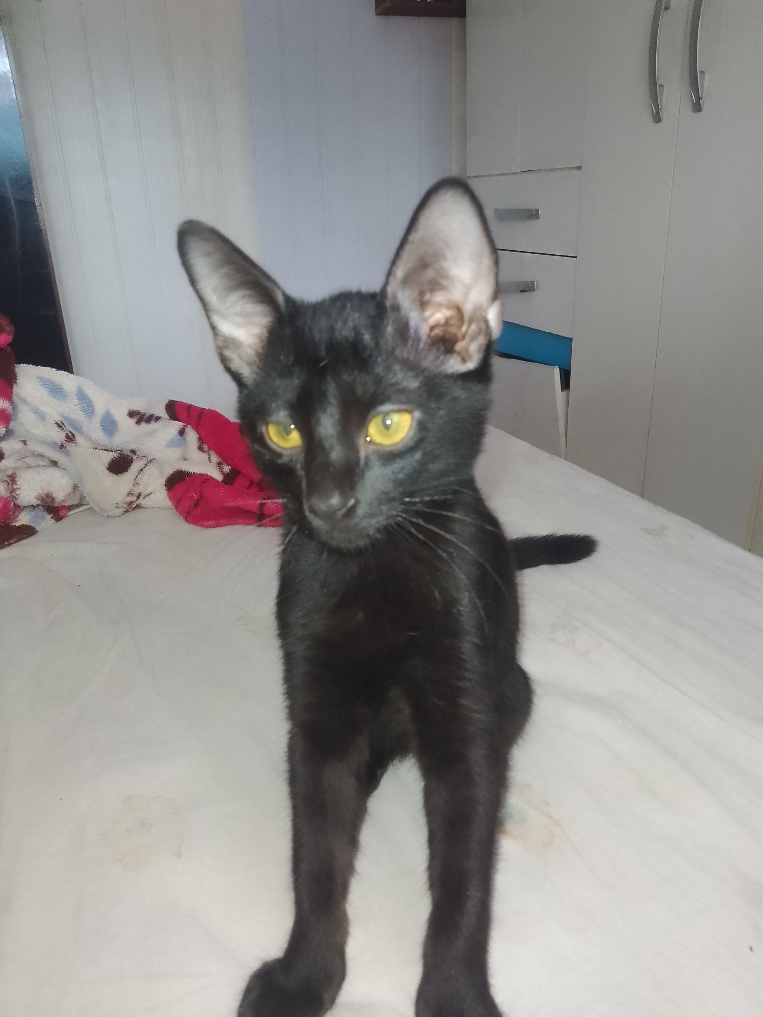 Descrição: Este adorável gato American Shorthair está à procura de um lar amoroso. Com apenas 2 a 6 meses de idade, ele tem uma pelagem linda e preta. Seu porte é médio, e ele possui um temperamento muito interessante. Ele é brincalhão e adora interagir, o que o torna um companheiro divertido para qualquer família. No entanto, também tem um lado arisco, o que pode ser comum em filhotes, especialmente em novos ambientes.