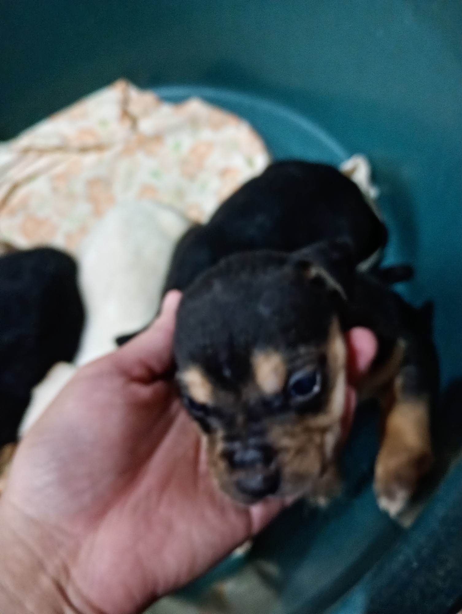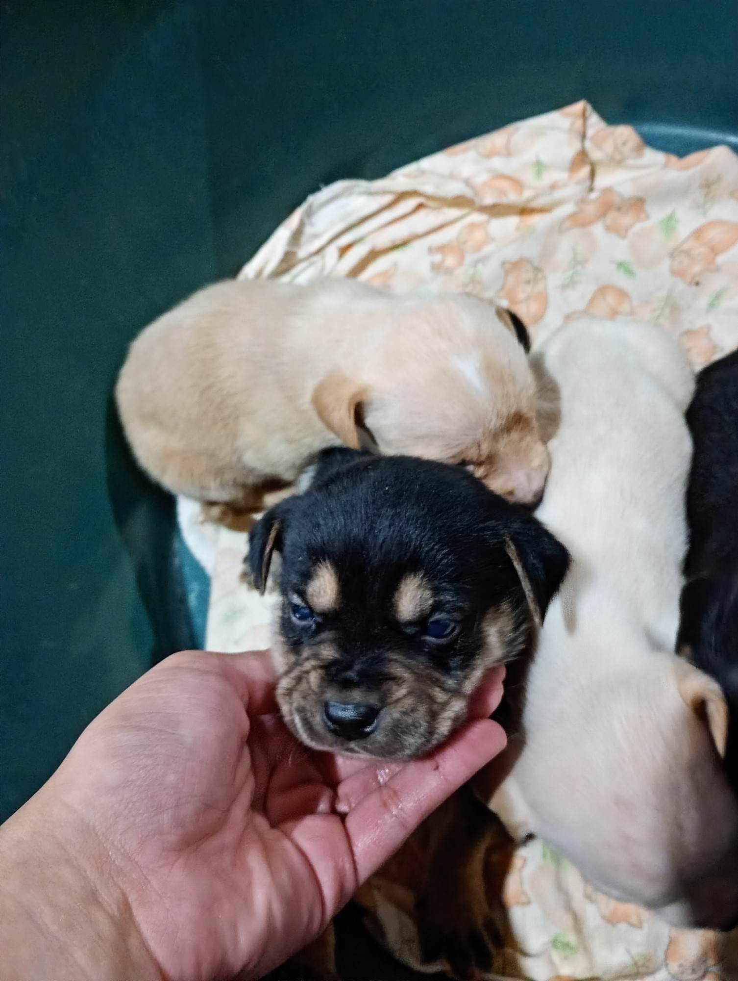 São 5 filhotes todos machos 3 pretos com marrom 1 branco e 1 beje .(A mãe está rejeitado os filhotes)