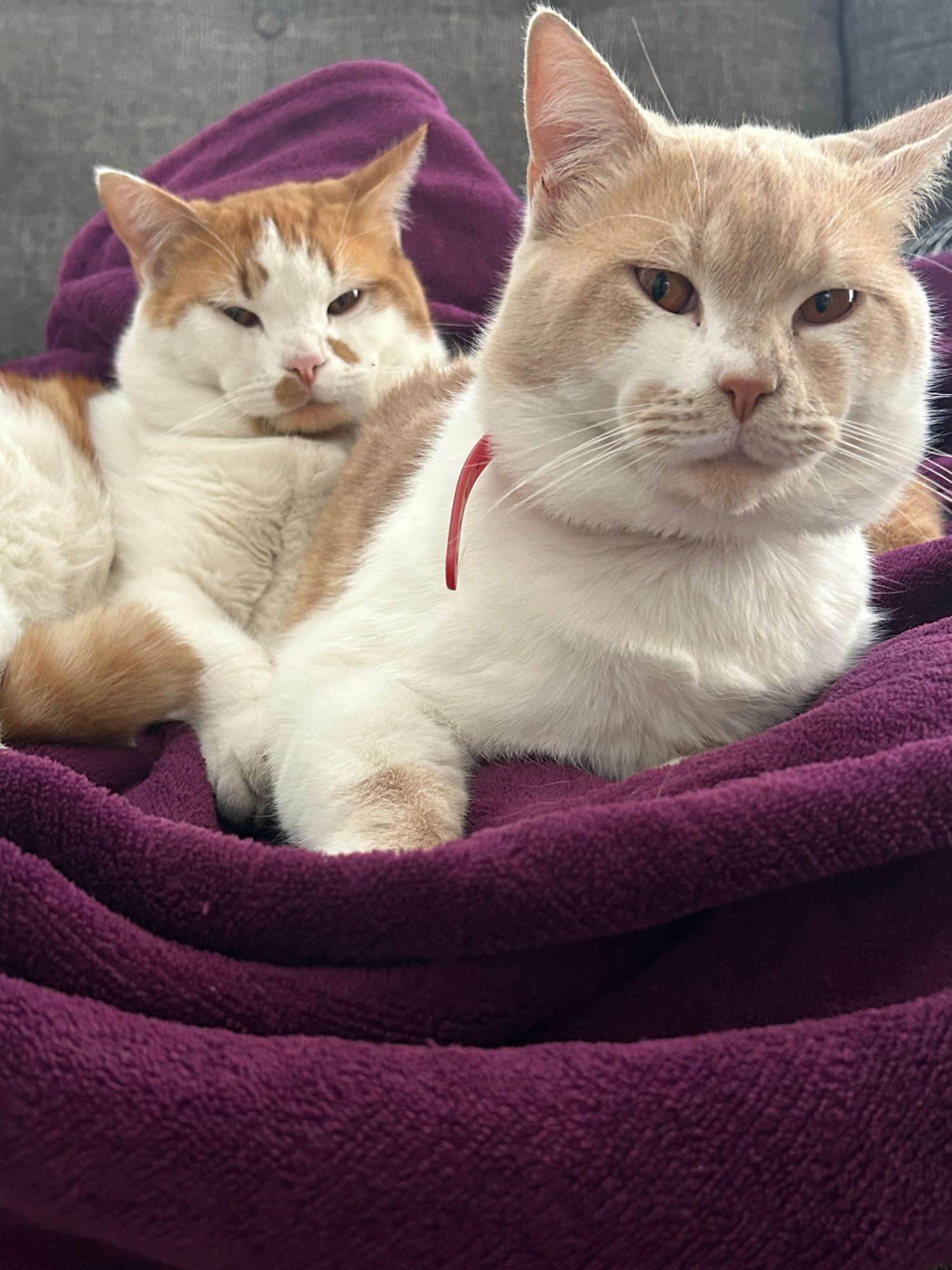 ”Thiago e Dagoberto são gatinhos irmãos de ninhada, castrados e vermifugados, thiago é extremamente dócil e Dagoberto mais independente, mas sempre demonstra seu amor através de ronronados e patinhas. Ambos possuem 1 ano e 2 meses de idade.”