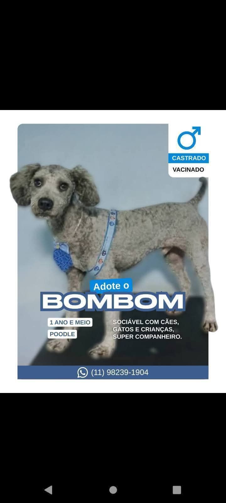 Bombom é um lindo cãozinho muito companheiro, carente, muito educado, faz as necessidades no jornal, não levanta a perna pra fazer xixi w não marca território. Ama crianças, se da bem com outros animais.