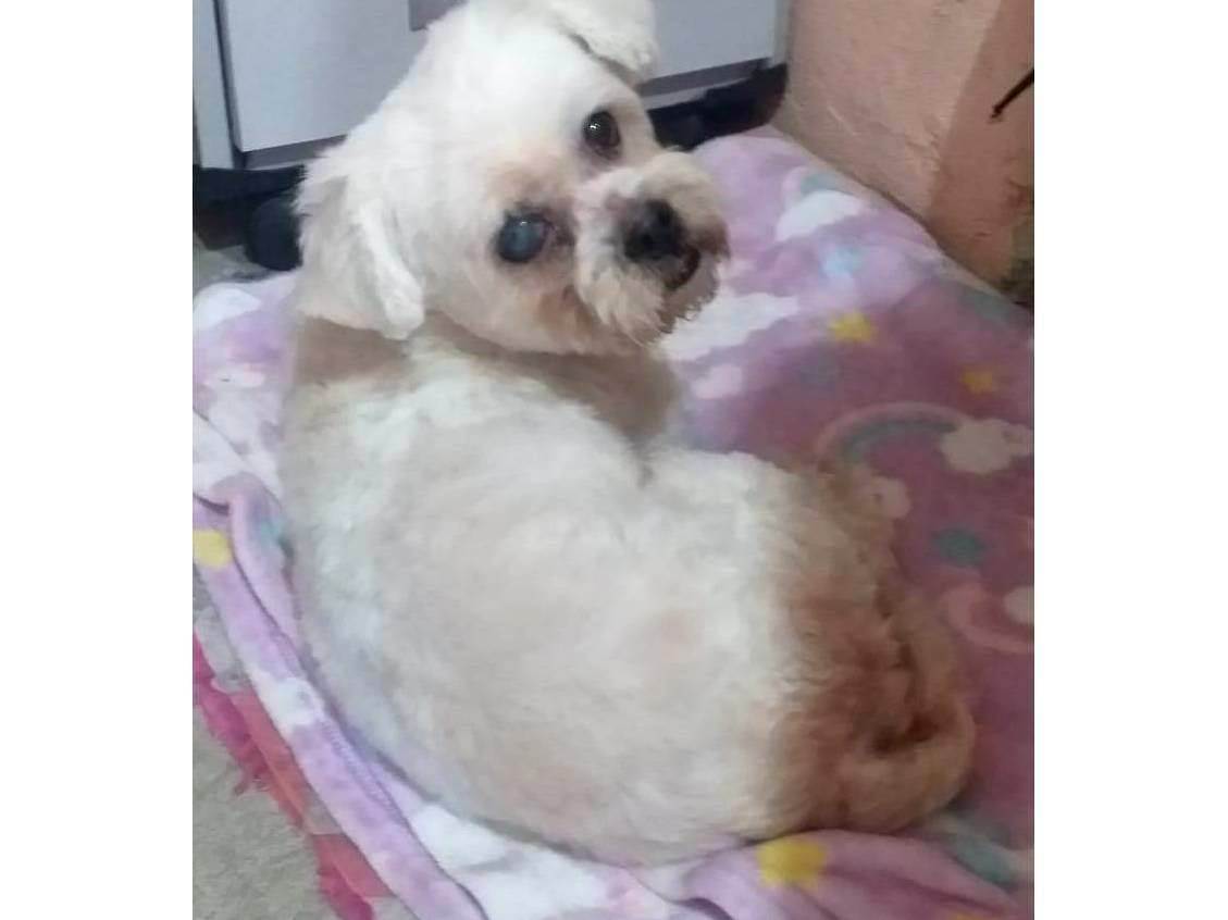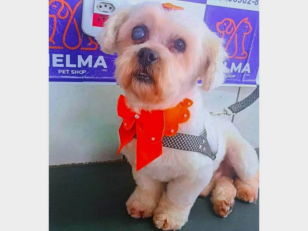 Cachorrinho de porte pequeno, com a pelagem branca e lisa, provável mistura de lhasa. Tem deficiência visual em um dos olhos. Calmo, sociável e um pouco tímido. Não tem pulgas ou carrapatos.