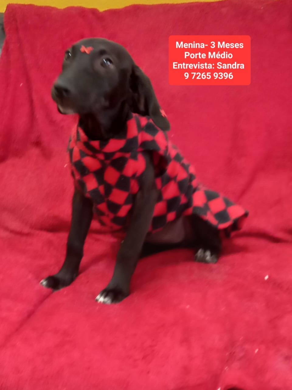 Gaby é uma adorável cadelinha SRD-Vira Lata. Ela tem 3 meses e possui pelagem preta, com porte médio e características incrivelmente afetuosas. Gaby é uma cachorrinha dócil, calma, brincalhona e muito sociável. Ela adora a companhia de pessoas, crianças, gatos e até mesmo outros cães!