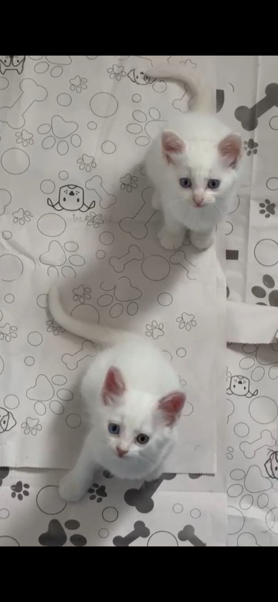 Lindos gatinhos brancos peludos, uma fêmea de olhos azuis e um macho com um olho de cada cor.