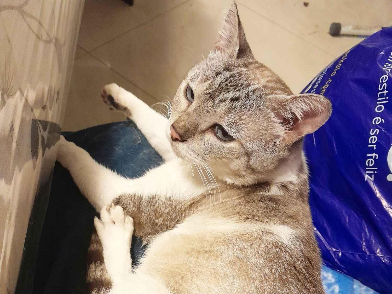 Rafinha Rodolfo Periquitinho é uma gracinha de gatinho que foi ganhando os nomes pomposamente! Um pequeno (literalmente) gatinho jovem adulto, de aproximadamente 1 aninho e meio a 2, que ou foi abandonado ou fugiu de casa, um amor de gatinho, sobrevivente das ruas!