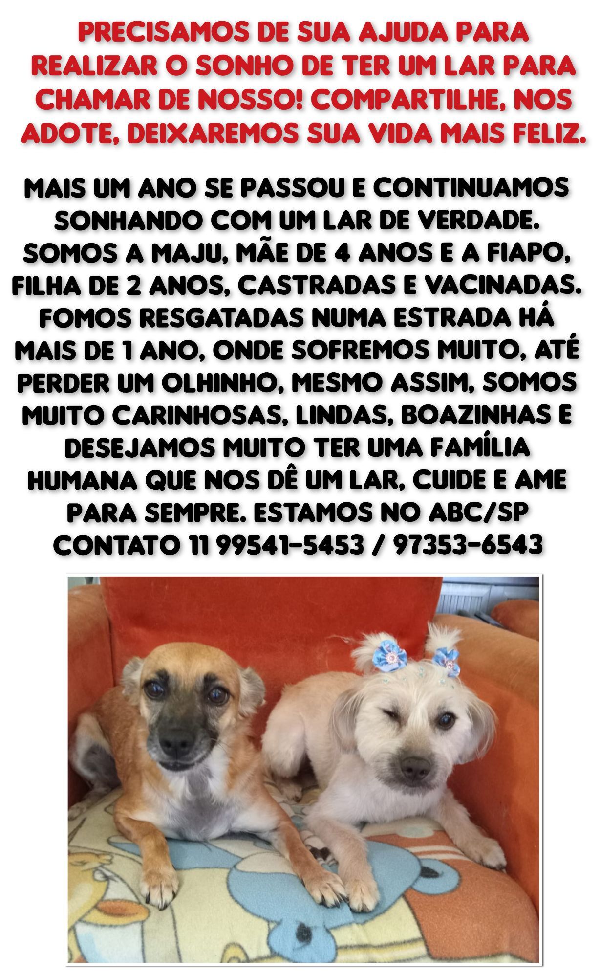 Fiapo e Maju são lindas cadelas SRD-ViraLata com pelagem caramelo, com apenas 2 anos de idade e porte pequeno. Elas são a companhia perfeita para quem busca amor e lealdade. Ambas estão castradas, vacinadas e vermifugadas, prontas para encontrar um lar amoroso. Conhecidas por seu temperamento dócil, elas são muito sociáveis e adoram a companhia de pessoas e outros animais. Fiapo e Maju se adaptam bem tanto em casas com quintal quanto em apartamentos, desde que tenham espaço para brincar e se divertir. Se você procura por um par de amigas fiéis e carentes de afeto, essas cadelinhas são a escolha ideal. Dê a elas uma chance e receba em troca muito amor e alegria. Entre em contato para conhecer Fiapo e Maju e quem sabe levá-las para sua casa!