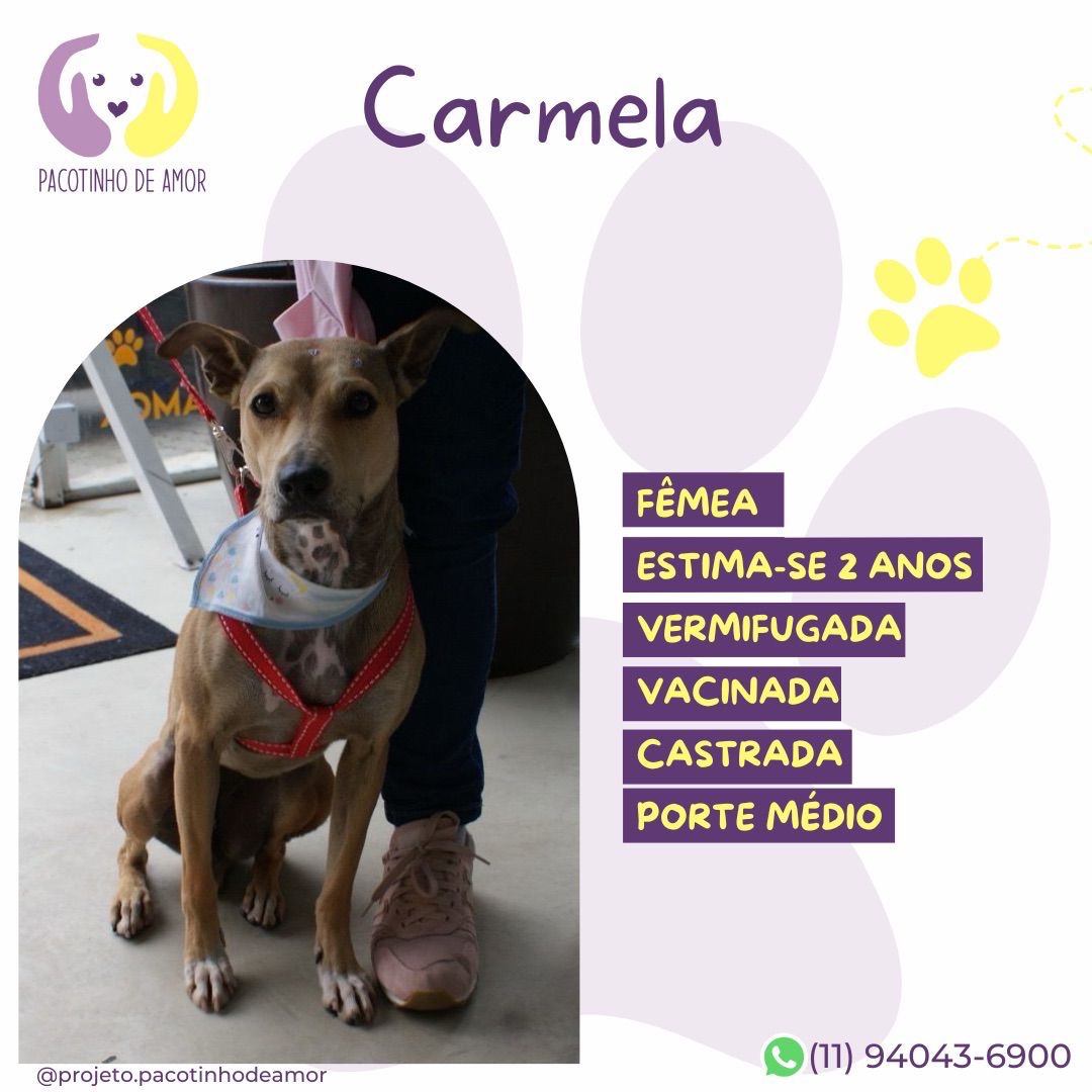 Carmela  Fêmea   Raça: SRD-ViraLata  Porte: Medio   Idade: 2 anos Pelagem: Branca,Marrom