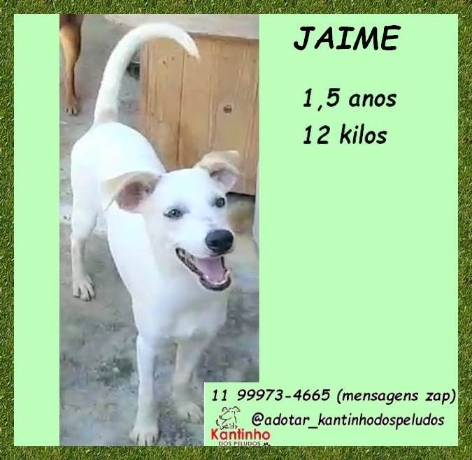 Jaime  Macho   Raça: SRD-ViraLata  Porte: Pequeno   Idade: 1 ano Pelagem: Branca    Para adotar entre em contato no Whatts (11) 99973-4665