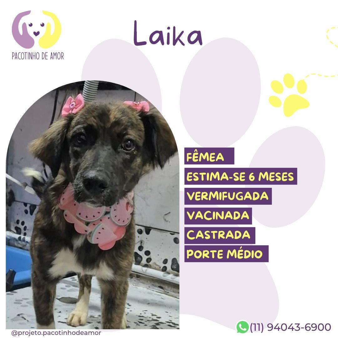 Laika  Fêmea   Raça: SRD-ViraLata  Porte: Medio   Idade: 2 a 6 meses Pelagem: Rajada    Critérios para adoção