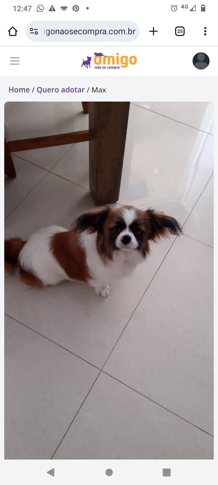 Eu sou o Max fui abandonado . Eu andava com outros amigos numa zona rural meus amigos eram todos muito grandes. Até que fui resgatado por uma pessoa mas ela já tem 11 outros amiguinhos e não tem como ficar comigo. Preciso de um lar. Max estava magro com muita fone e sede e uma infecção que já foi curada. Quero levar muitas alegrias pra sua casa. Sou brincalhão , dócil.