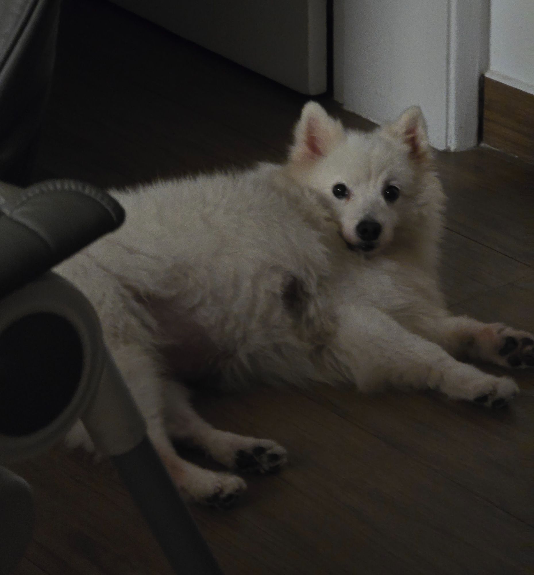 Cão da raça Spitz Japonês, vive em apartamento desde o 1o ano de idade, tem 8 anos. Um pouco reativa com outros cachorros.