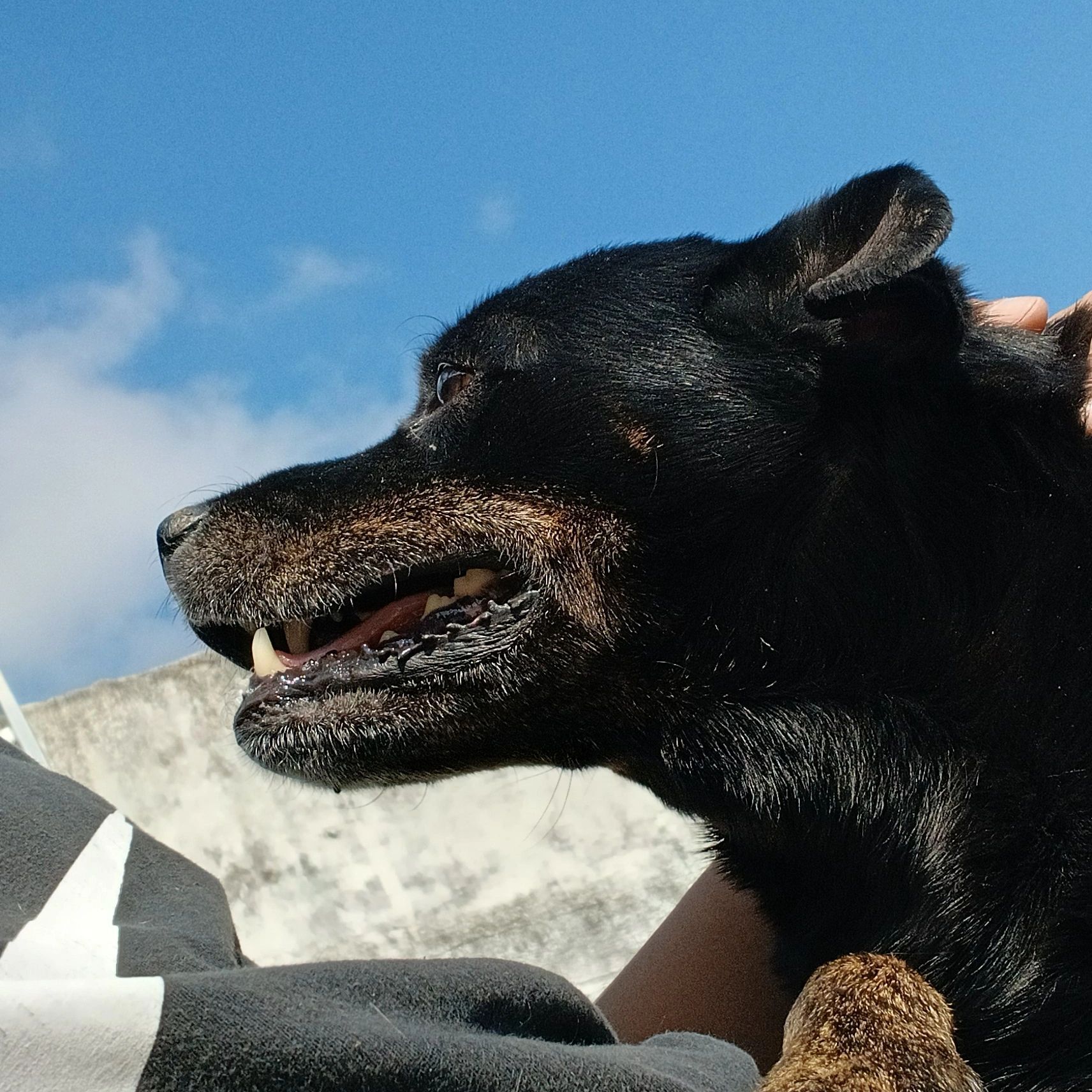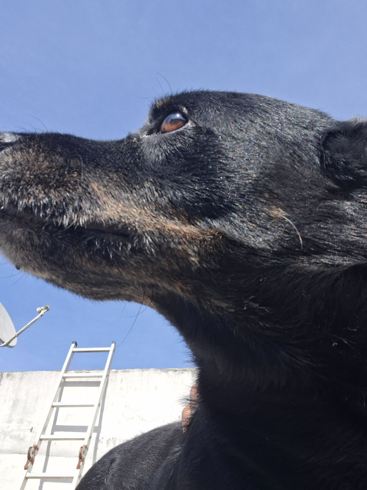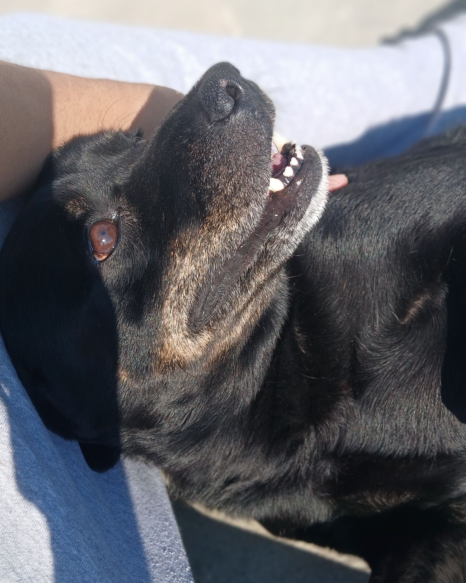 Cachorro preto, com patas douradas, médio porte cerca de 9-10 anos, brincalhão e energético